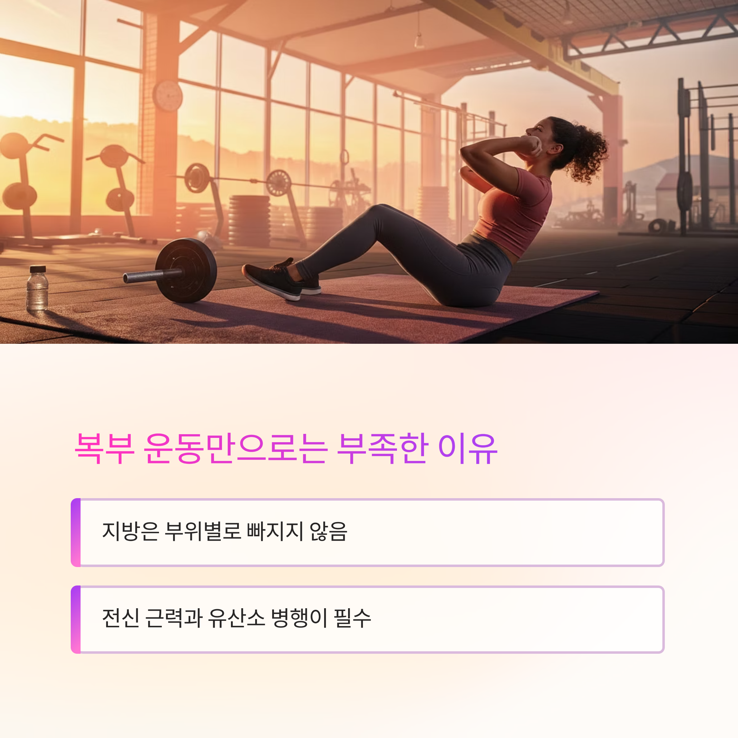 ‘윗몸일으키기 100개’로는 복부 지방을 제거할 수 없습니다. 왜냐하면 지방은 국소적으로 빠지지 않기 때문입니다. 복부 운동은 근육을 단단하게 만들 뿐, 체지방 연소는 전신 에너지 소비를 통해 이루어집니다.