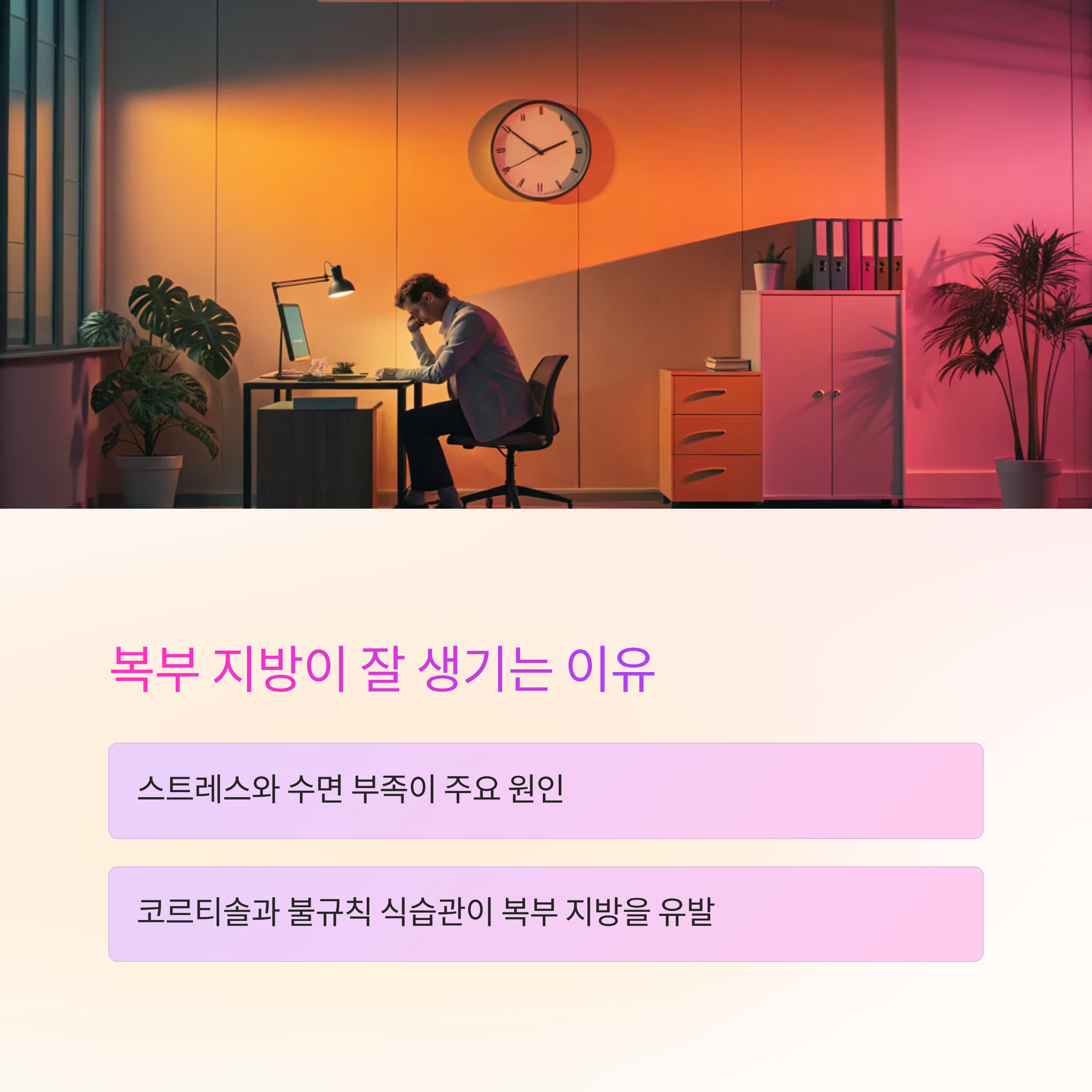 복부 지방은 단순한 체형 문제가 아니라 대사 건강과 직결된 신호입니다. 스트레스, 불규칙한 식습관, 수면 부족, 과도한 탄수화물 섭취 등이 원인이 됩니다.