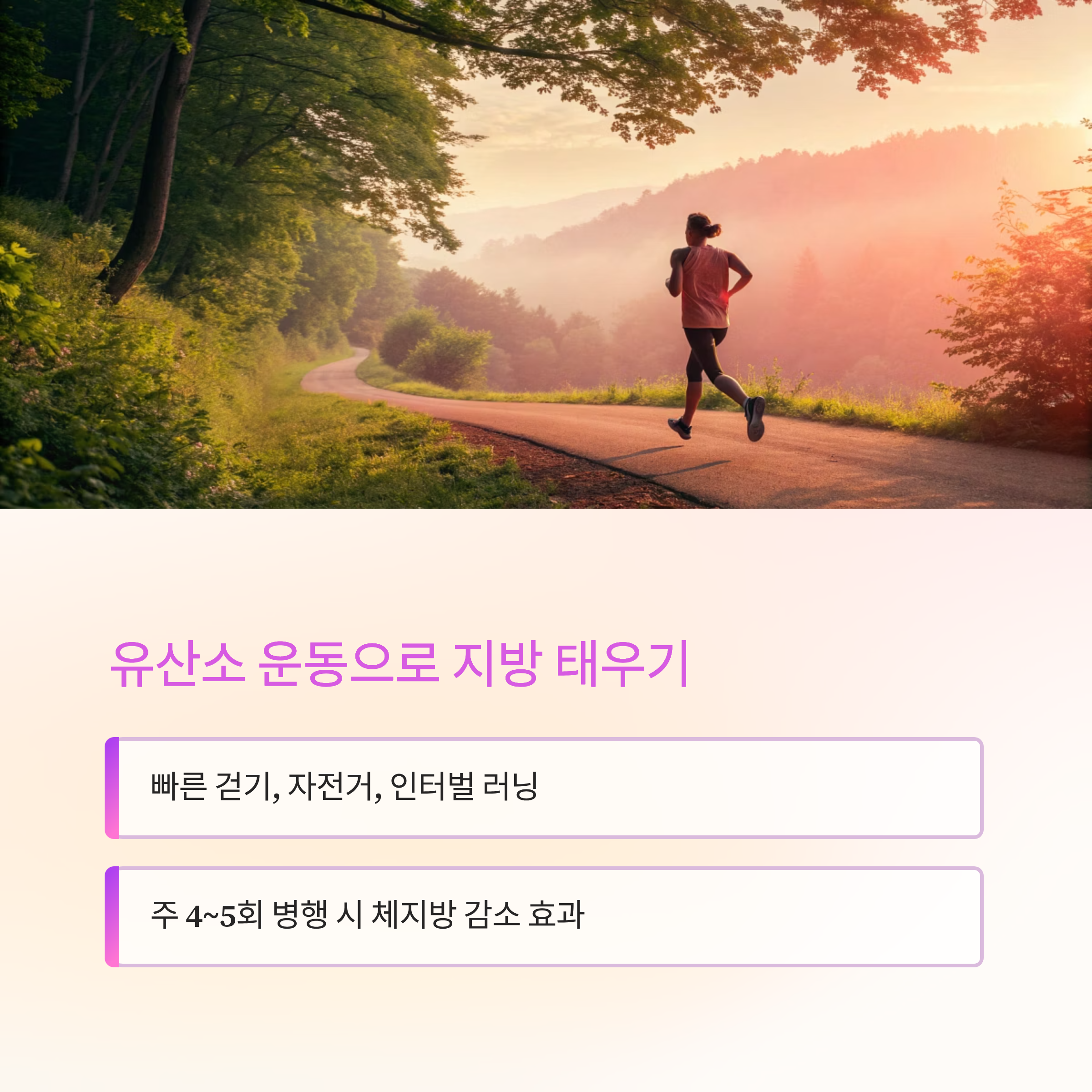 유산소 운동은 복부 지방 연소의 핵심입니다. 운동 강도는 최대심박수의 60~70%가 가장 효과적입니다.