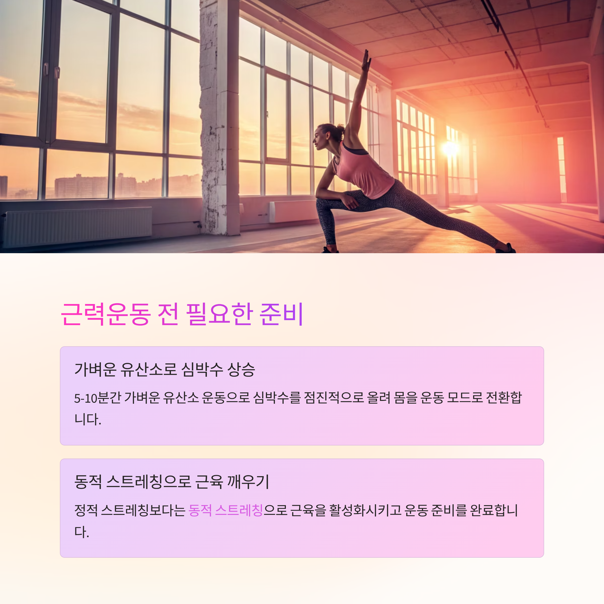 근력운동 전 워밍업과 동적 스트레칭은 부상을 예방하고 운동 능력을 향상시키는 필수 과정입니다. 상체·하체·코어를 단계적으로 준비시키고, 10분 정도 투자하는 것만으로도 운동 효율은 크게 달라집니다. 꾸준히 습관화한다면 건강하고 안전하게 근력운동을 즐길 수 있습니다.