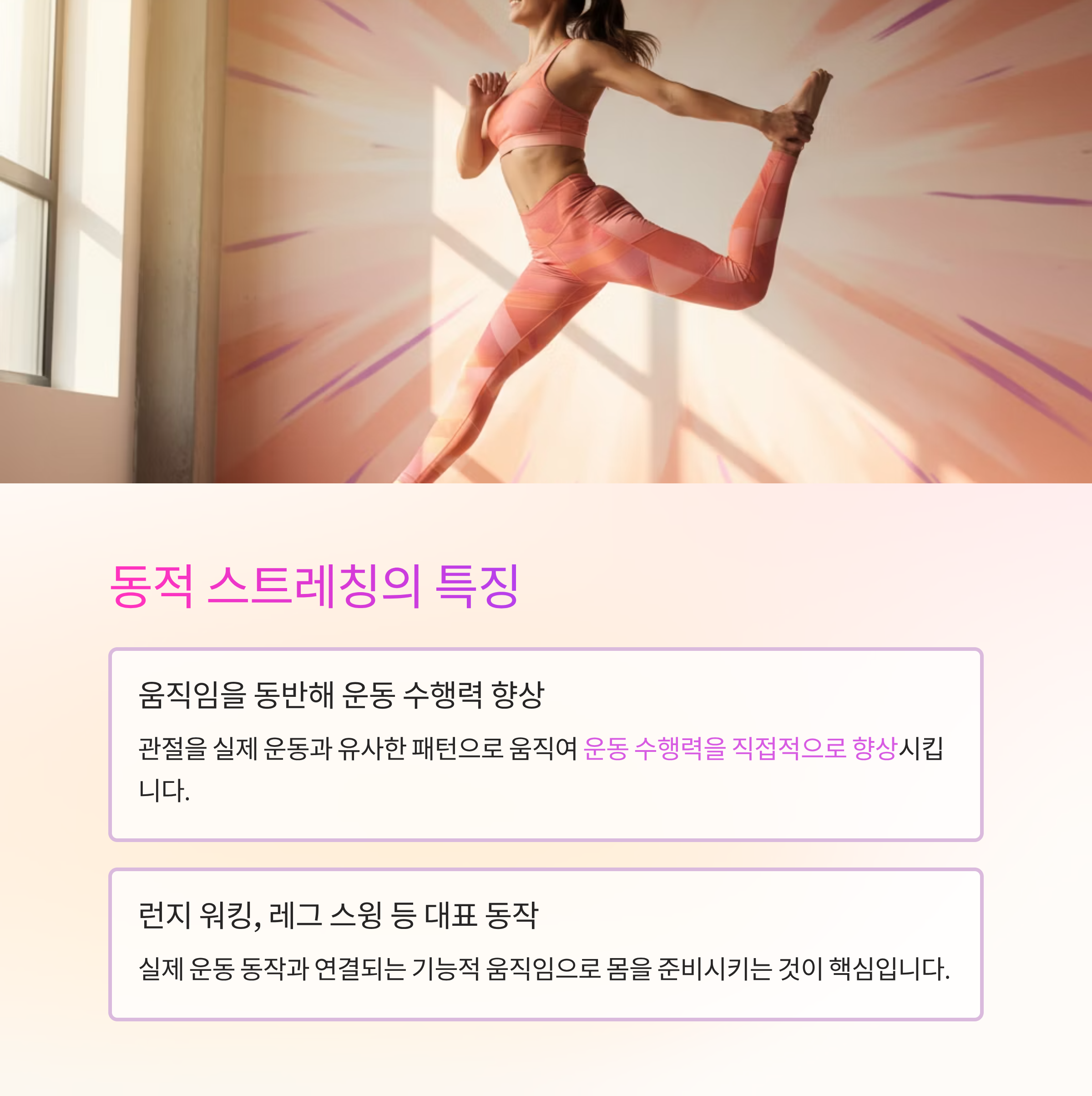 동적 스트레칭은 근육을 늘린 상태에서 움직임을 동반하는 방식입니다. 예를 들어, 런지 워킹이나 레그 스윙 같은 동작은 하체 근육과 관절을 자연스럽게 풀어주면서도 운동에 필요한 자극을 줍니다. 정적 스트레칭이 근육의 긴장을 풀어주는 데 집중한다면, 동적 스트레칭은 운동 수행력 향상에 더 효과적입니다.