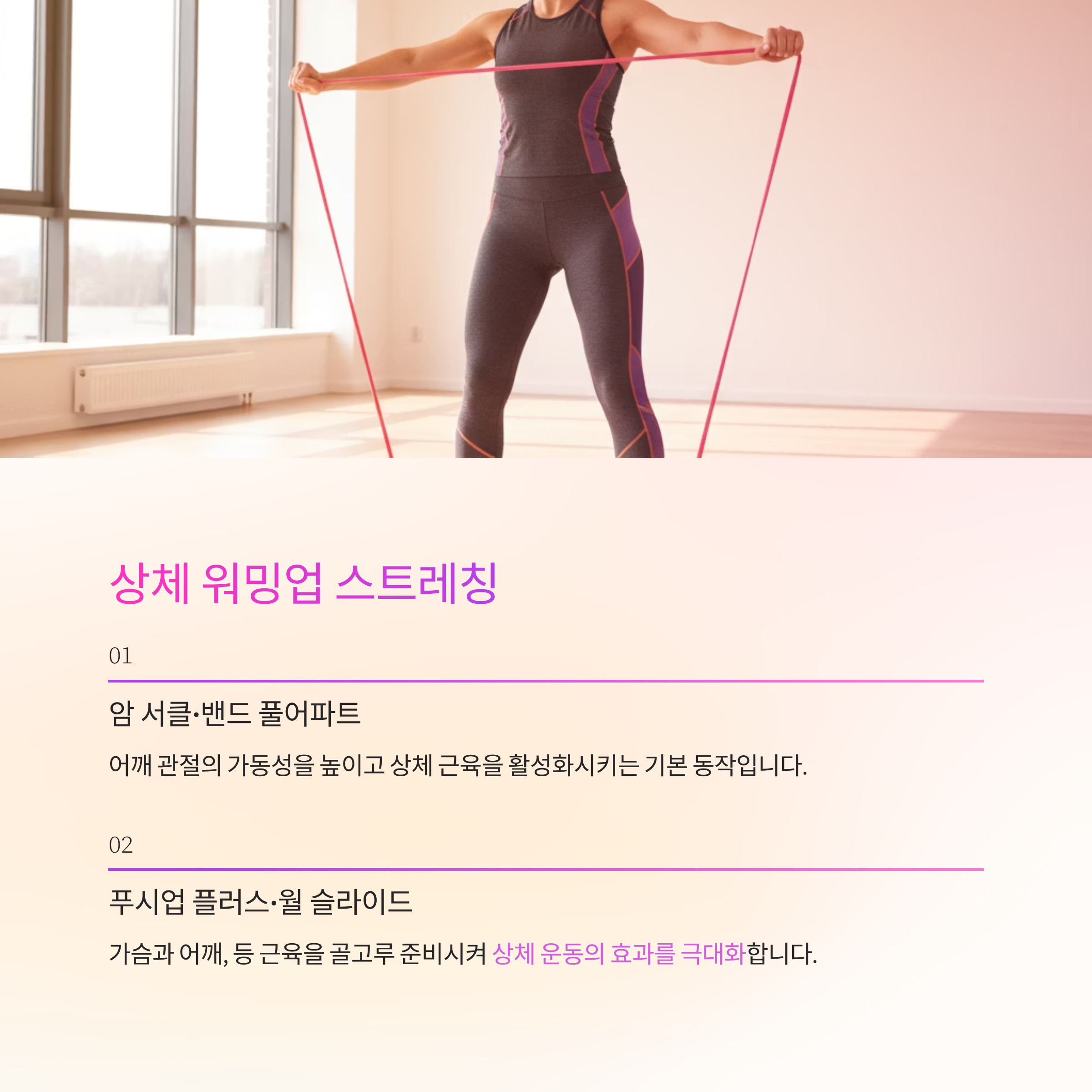 - 밴드 풀어파트: 탄력 밴드를 잡고 양팔을 벌려 어깨와 등 근육을 활성화합니다.