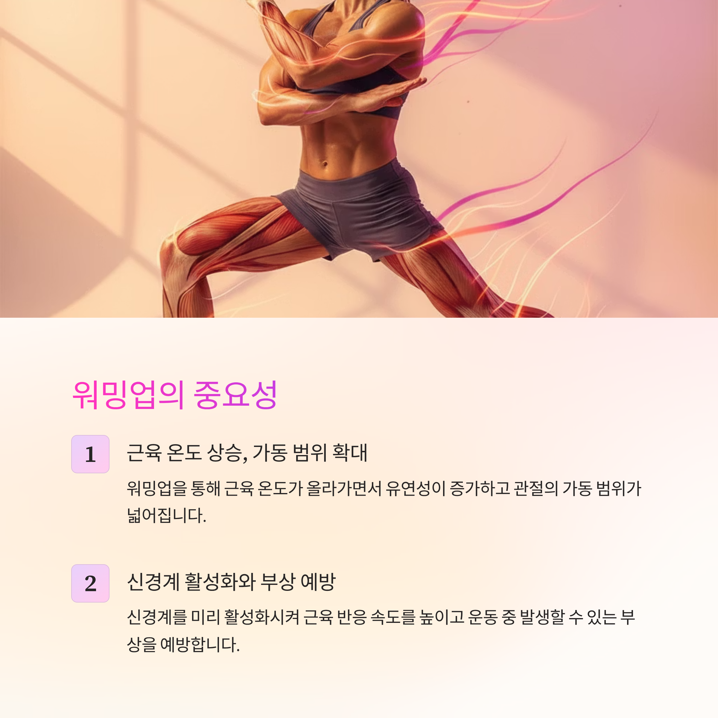5. 본 운동 시작 총 10분 내외의 워밍업만으로도 운동 효율이 극대화됩니다.