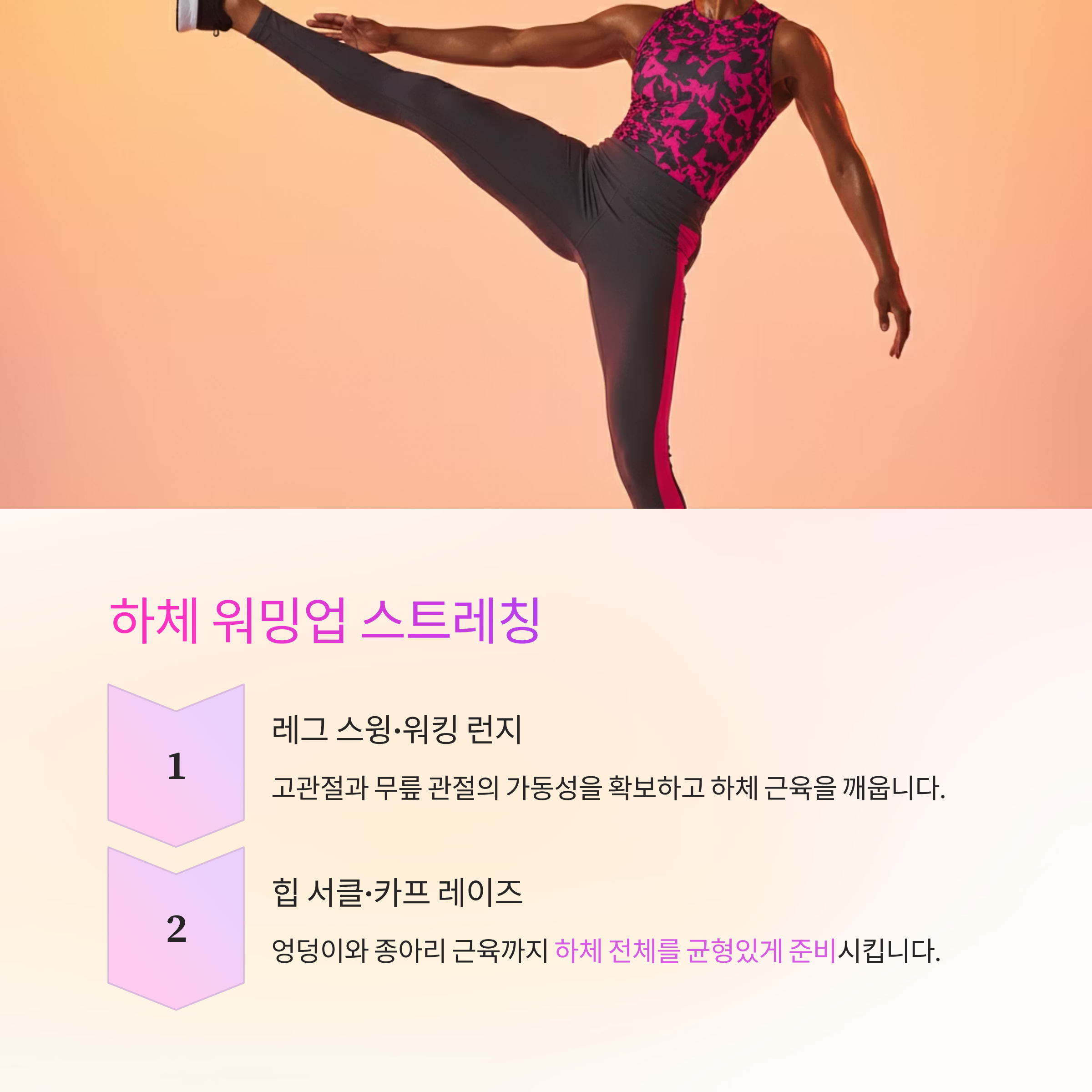 - 카프 레이즈: 종아리 근육을 준비시켜 점프나 스쿼트 시 충격 흡수를 돕습니다.