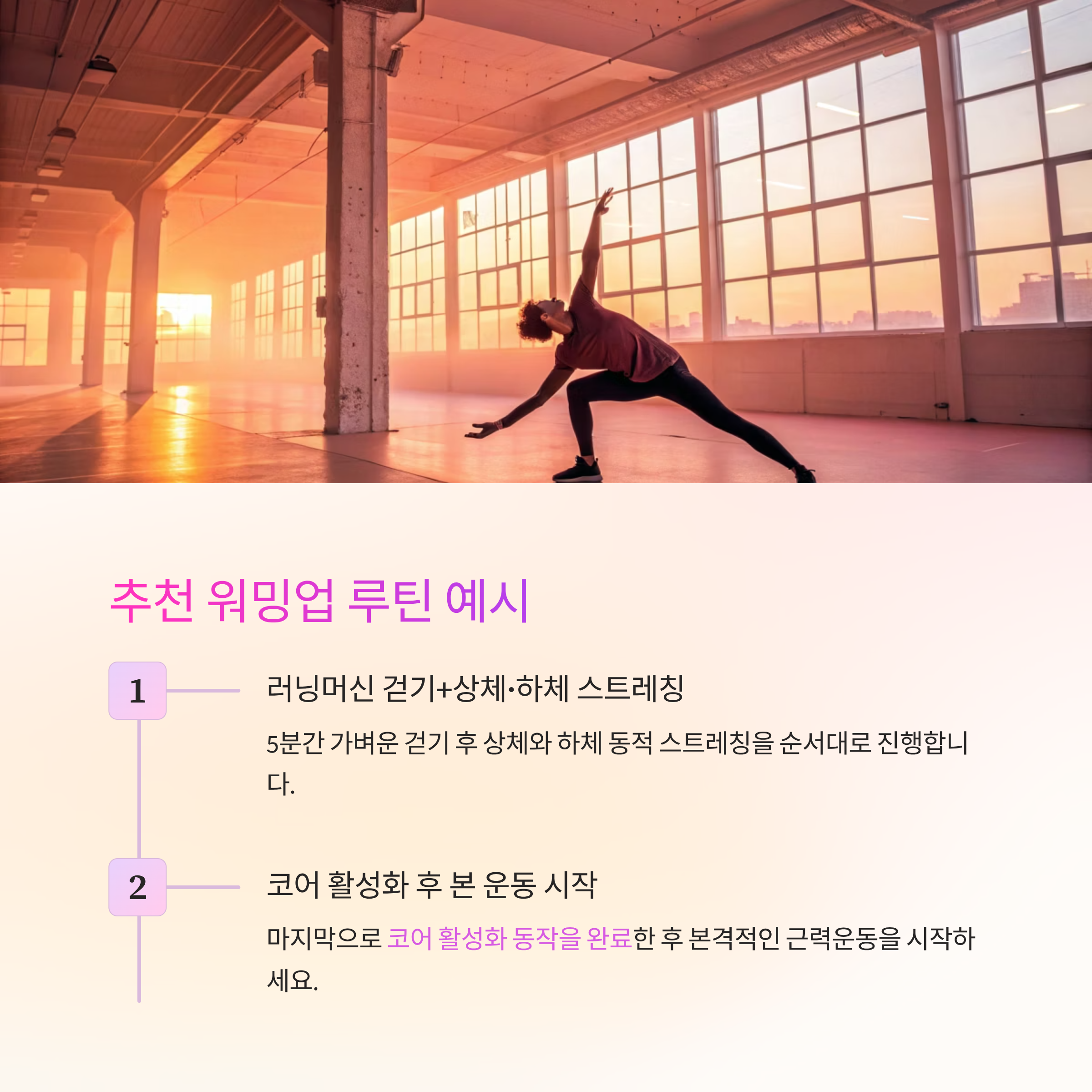 5. 본 운동 시작 총 10분 내외의 워밍업만으로도 운동 효율이 극대화됩니다.