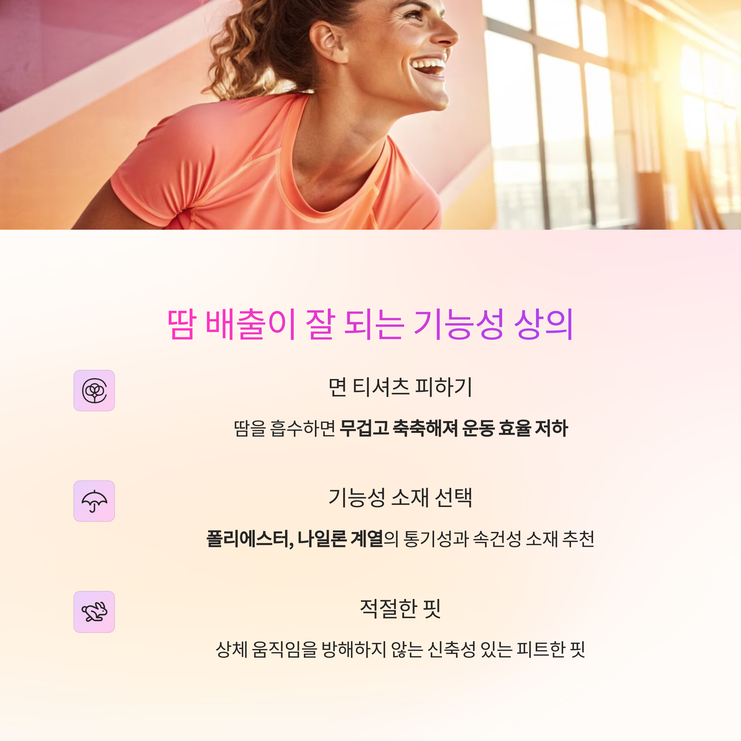- 실내운동은 민소매 또는 반팔, 야외운동은 긴팔 UV차단 상의 고려