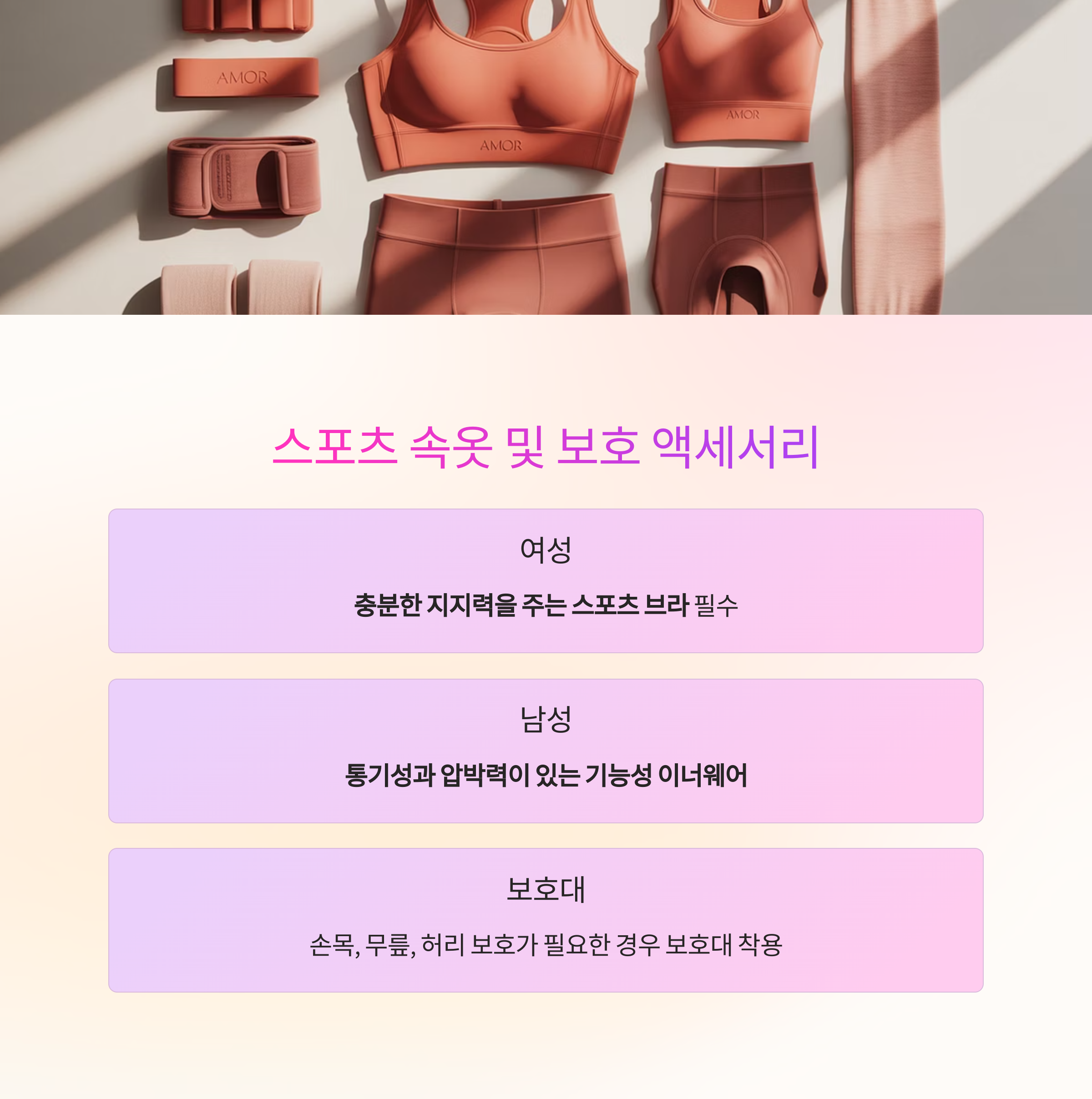- 장갑, 헤드밴드, 마스크 등은 운동 종류에 따라 보조적 선택 가능