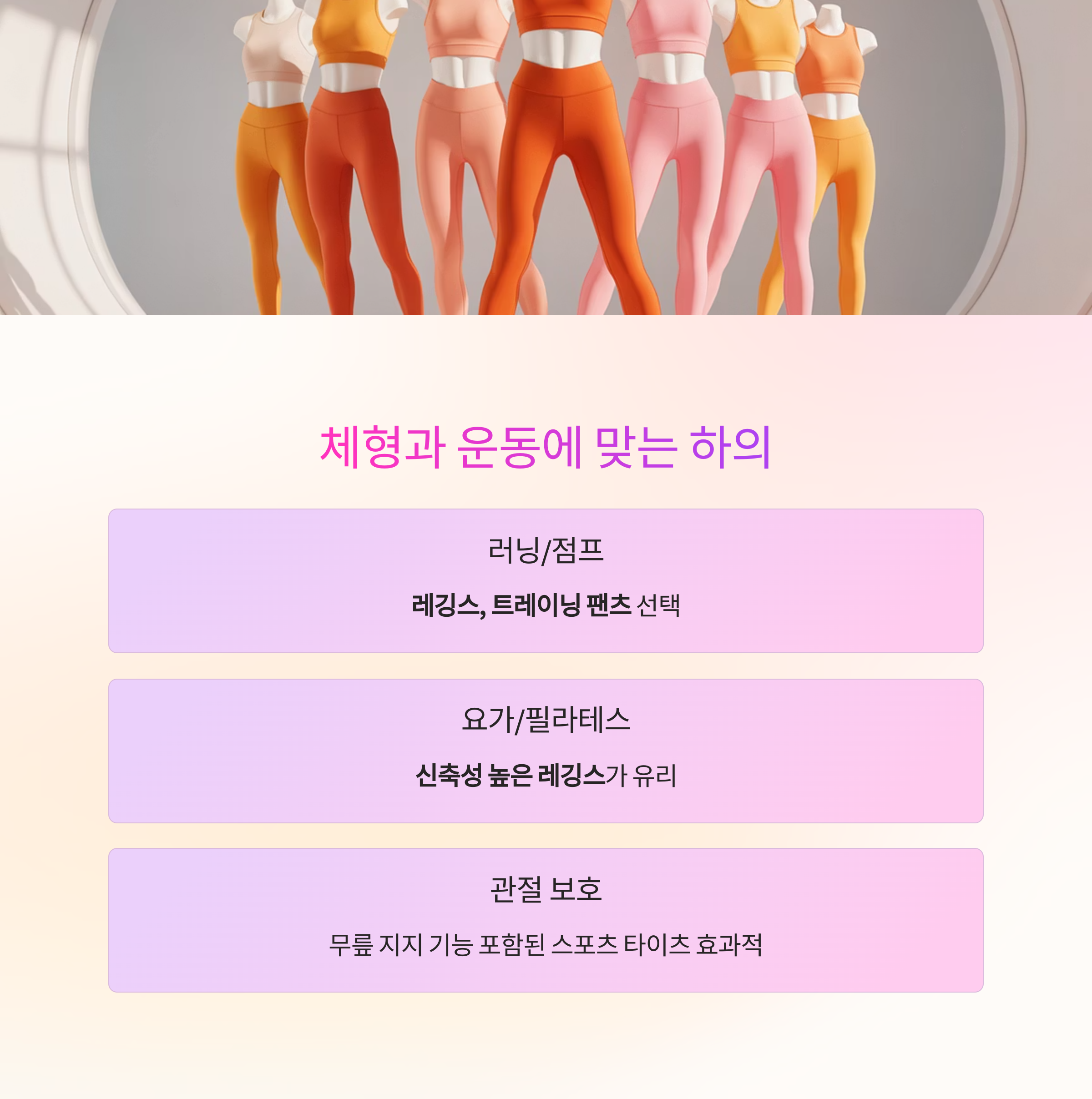 - 러닝, 점프 등 하체 움직임이 많다면 레깅스, 트레이닝 팬츠 선택