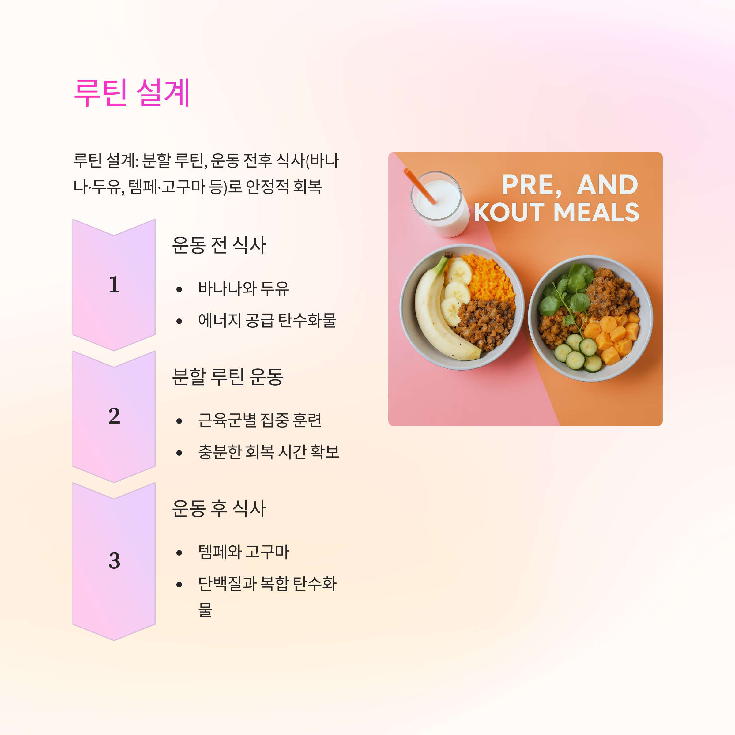 - 운동 후 30분 내 탄수+단백질 식사 전략