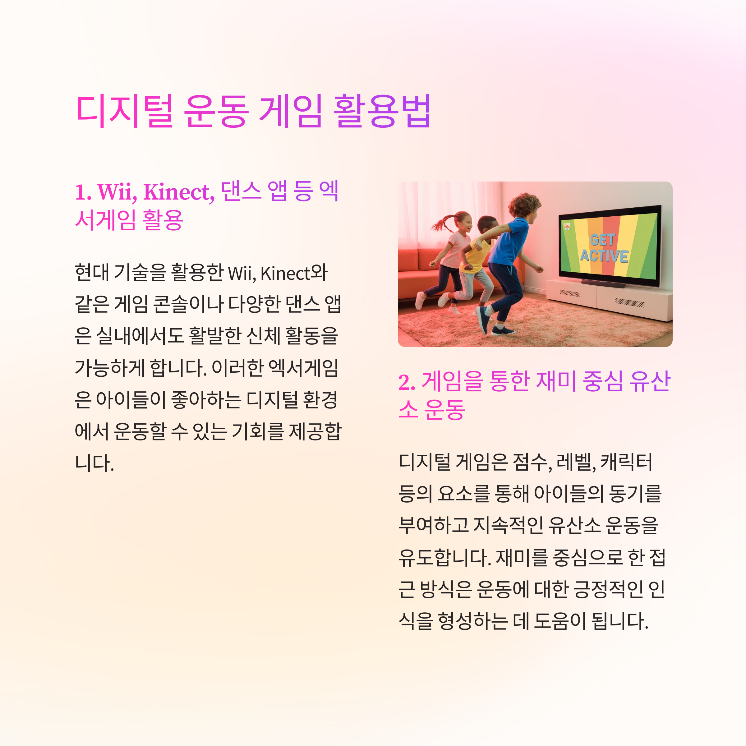 게임기나 스마트 기기를 활용한 엑서게임(Exergame)은 비만 아동에게 특히 효과적입니다.