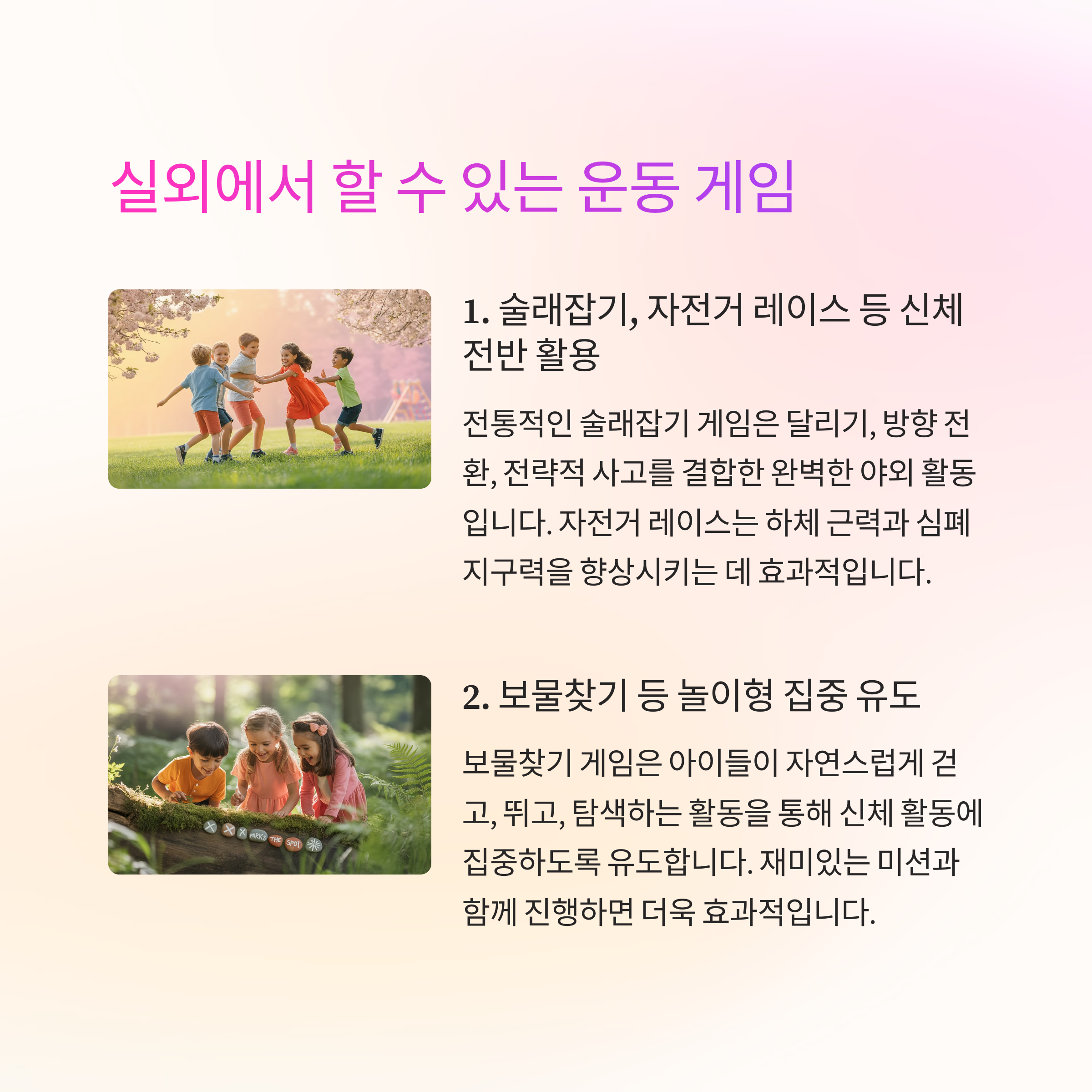 비만 아동은 단순히 '운동'만으로는 흥미를 유지하기 어렵습니다. 이때 게임 형태의 운동은 몰입도를 높이고, 자연스럽게 활동량을 늘려주는 좋은 방법입니다. 놀이처럼 보이지만, 심박수 증가, 근육 자극, 협응력 향상까지 운동 효과는 충분하죠!