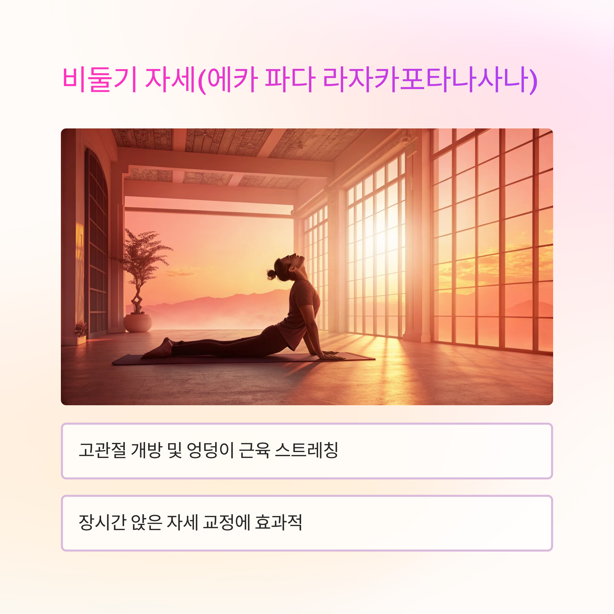앞다리는 접고, 뒷다리는 곧게 펴서 몸의 중심을 맞춘 자세로, 고관절을 깊게 열어줍니다. 이 자세는 장시간 앉아 있는 사람에게 특히 좋으며, 엉덩이·허벅지 근육의 긴장을 완화합니다. 균형을 유지하며 상체를 숙이거나, 심화 동작으로 팔을 머리 위로 올려 흉부를 여는 변형 자세로 발전시킬 수 있습니다.