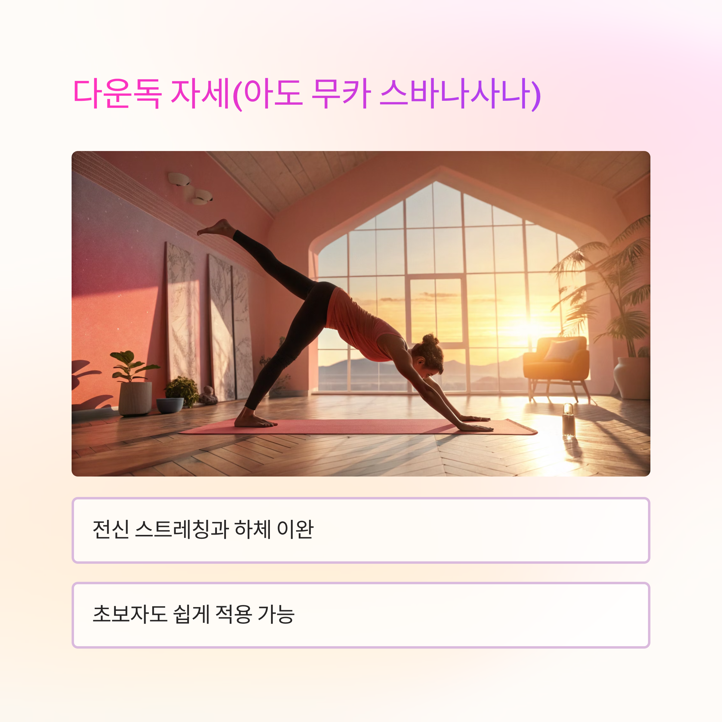요가의 대표적인 기본 자세로, 전신 스트레칭 효과가 있습니다. 손과 발을 바닥에 대고 엉덩이를 들어 올려 V자 모양을 만듭니다. 햄스트링, 종아리, 어깨, 손목까지 동시에 이완되며, 특히 하체 근육을 길게 늘여줍니다. 무릎을 살짝 굽히고 체중을 균등하게 분산하면 초보자도 부담 없이 수행할 수 있습니다.