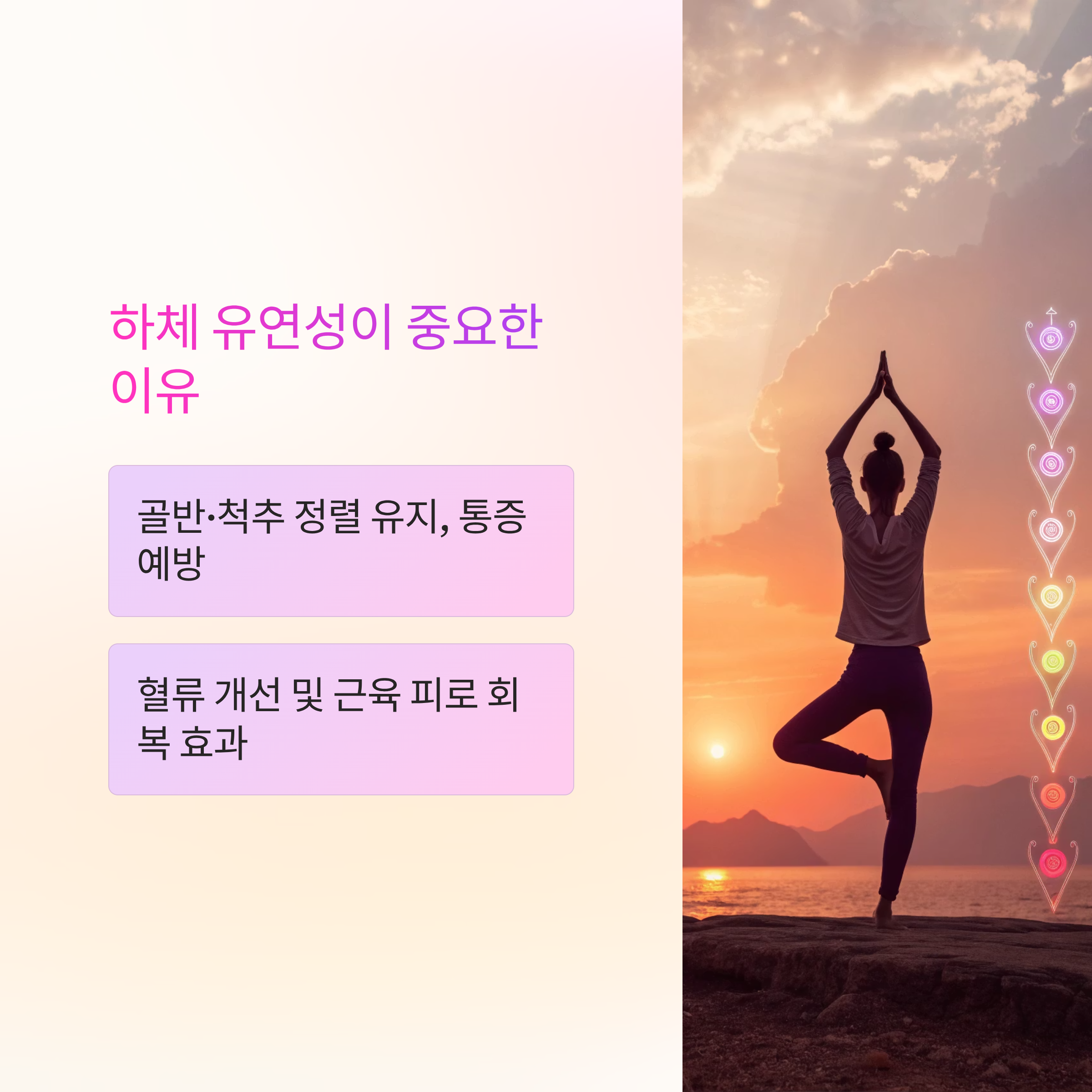유연한 하체는 단순한 스트레칭 수준을 넘어 혈액순환 개선, 근육 회복 촉진, 부상 예방에도 큰 도움을 줍니다.