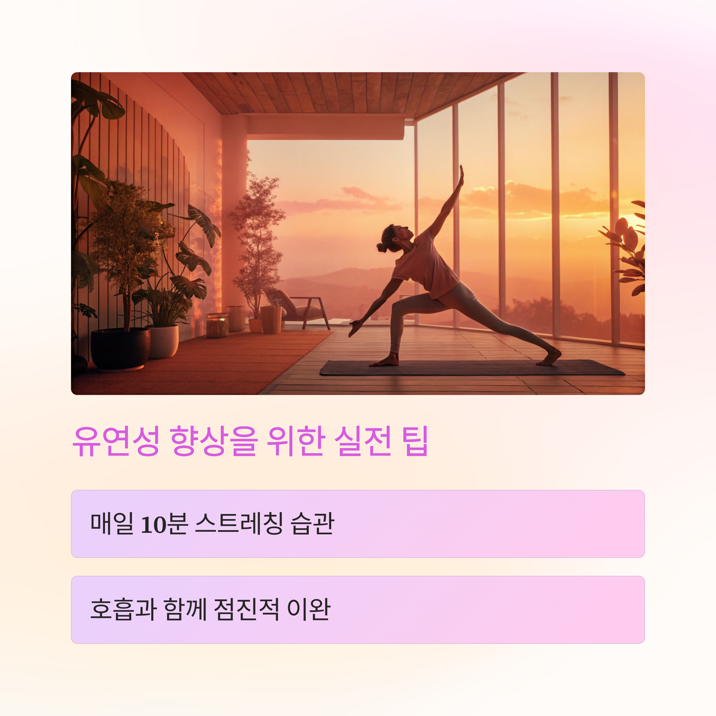 하체 유연성은 단순한 스트레칭이 아니라 자세 교정과 혈류 순환의 핵심 요소입니다. 전굴, 비둘기, 전사2, 다운독, 브릿지 자세를 꾸준히 반복하면 몸의 긴장이 풀리고 하체 피로가 눈에 띄게 줄어듭니다. 유연한 하체는 건강한 움직임의 시작입니다.
