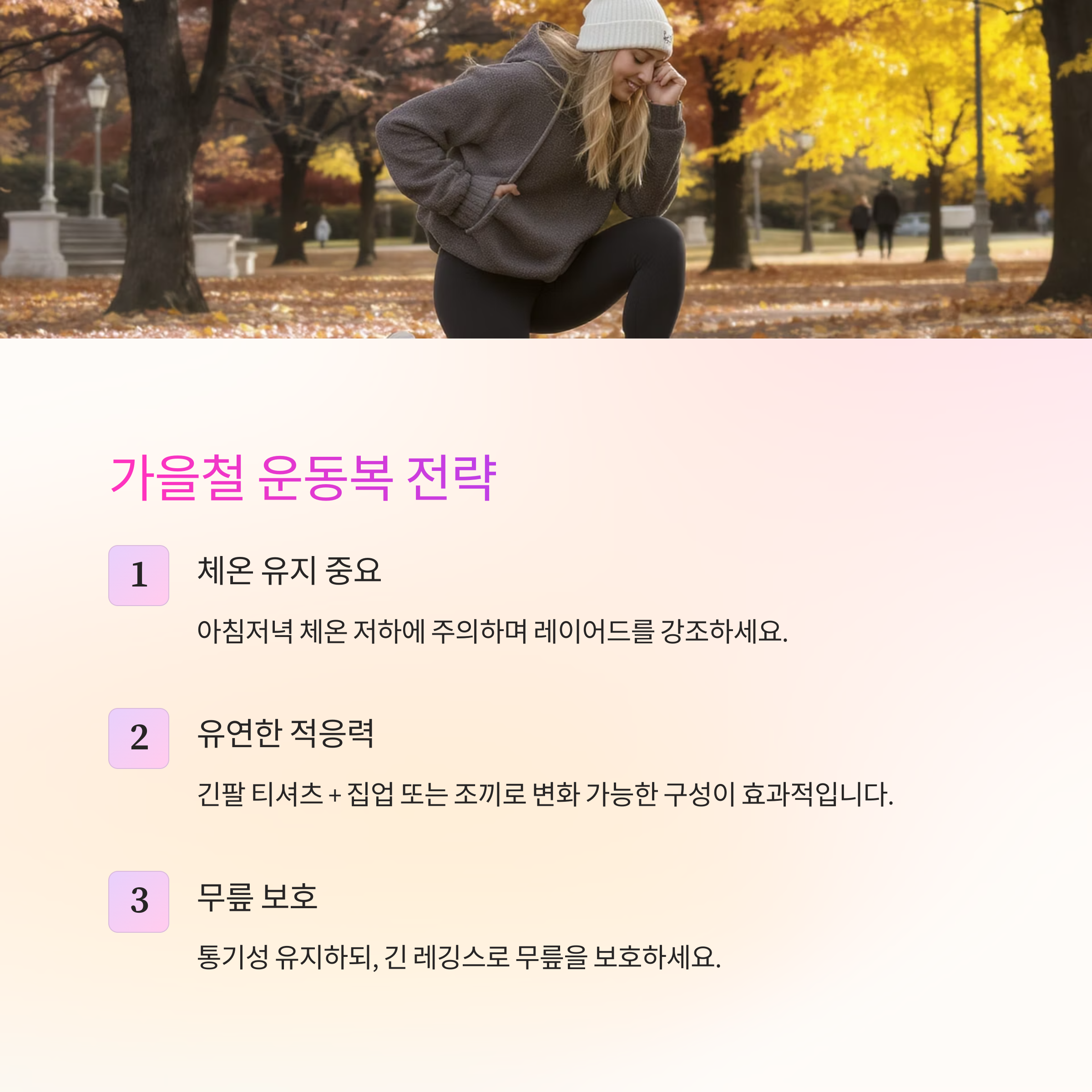 | 가을 | 보온 + 유연한 조합 | 새벽 운동 시 주의 |