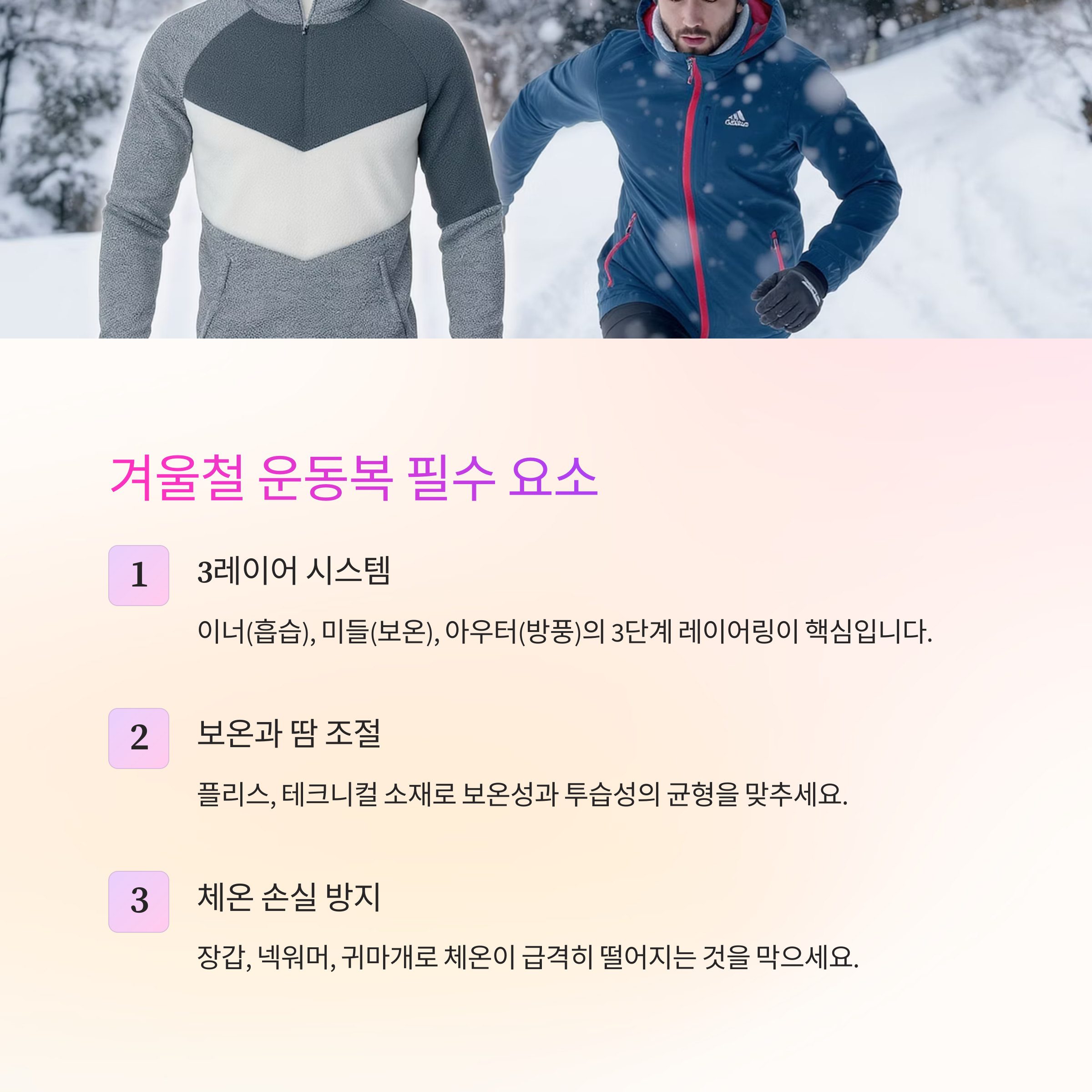 겨울에는 땀이 마르며 체온이 급격히 떨어지는 것을 막기 위한 조절 능력이 운동복 선택의 핵심입니다.