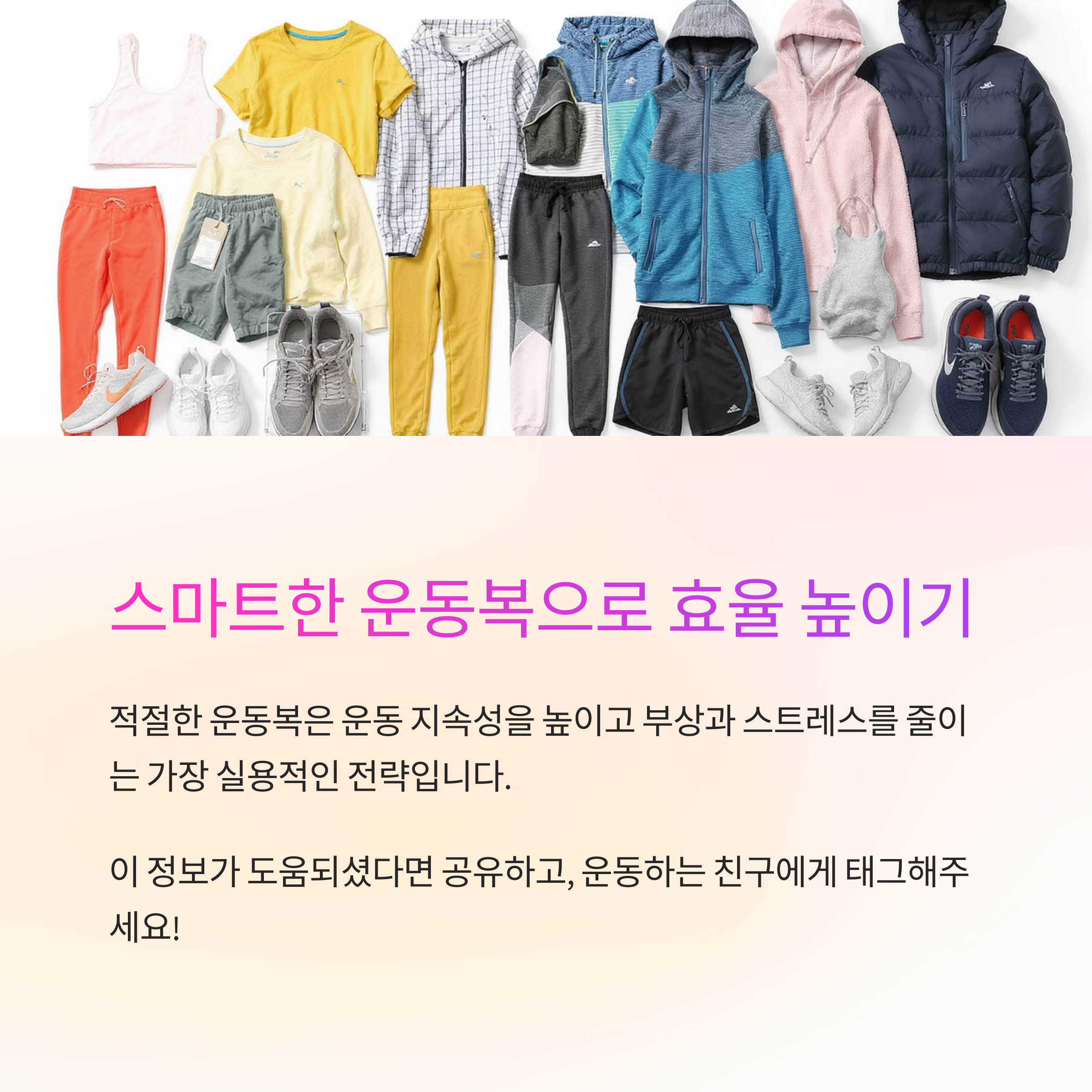 적절한 운동복 선택은 운동 지속성을 높이고 부상과 스트레스를 줄이는 가장 실용적인 전략입니다.