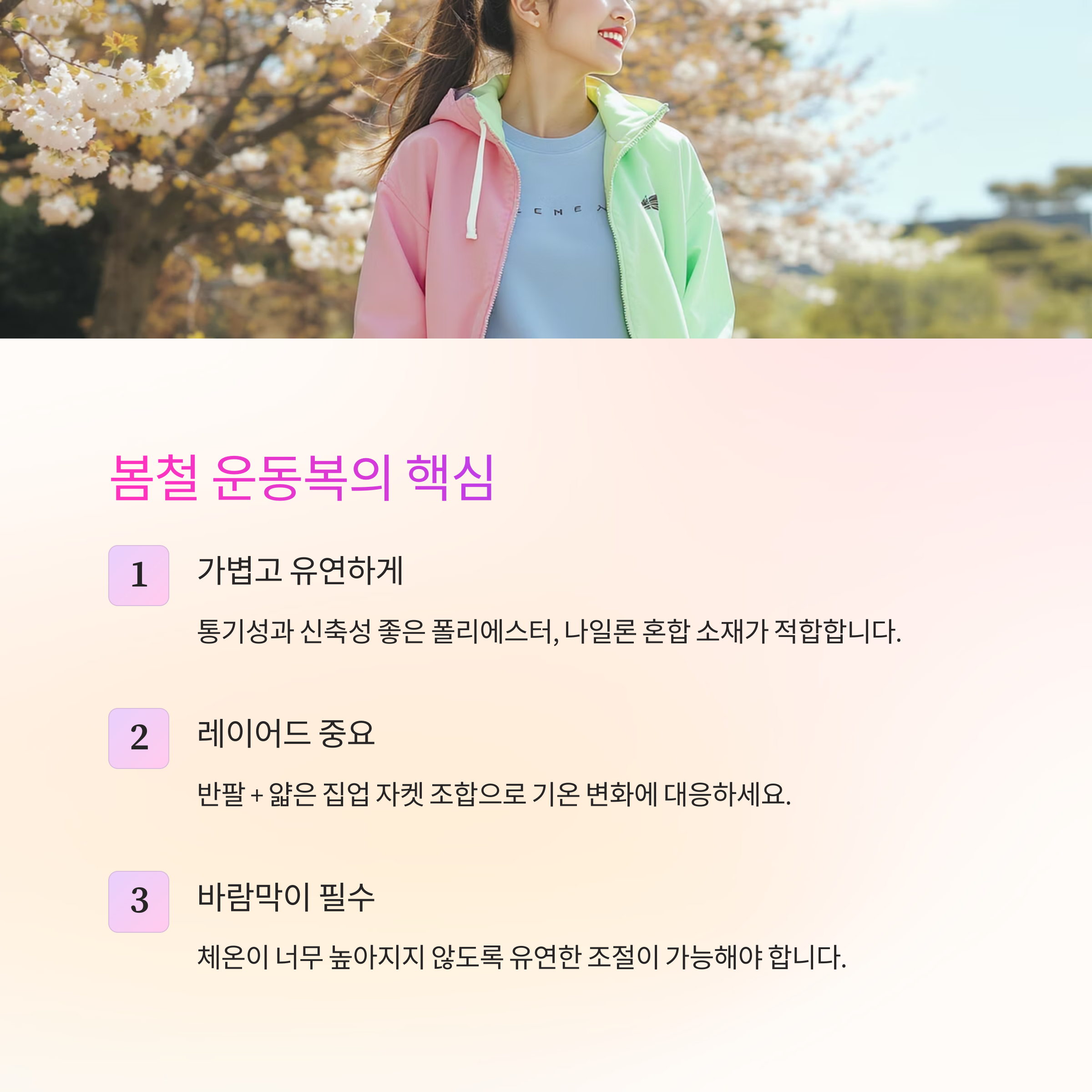 봄철 운동복: 가볍고 유연하게, 바람막이와 레이어드 중요