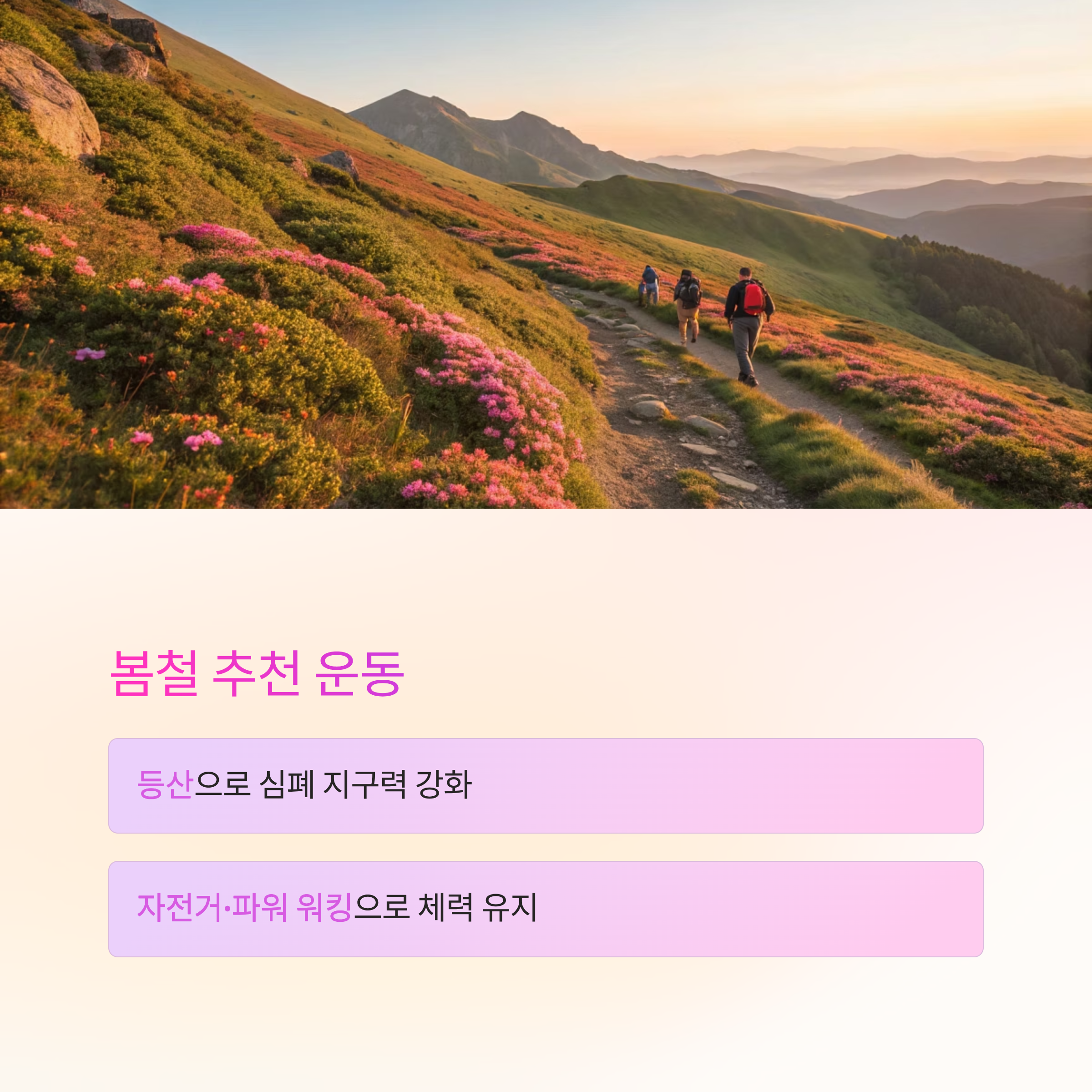1. 등산: 따뜻한 날씨와 만개한 꽃을 즐기며 심폐 지구력과 하체 근력을 강화할 수 있습니다.