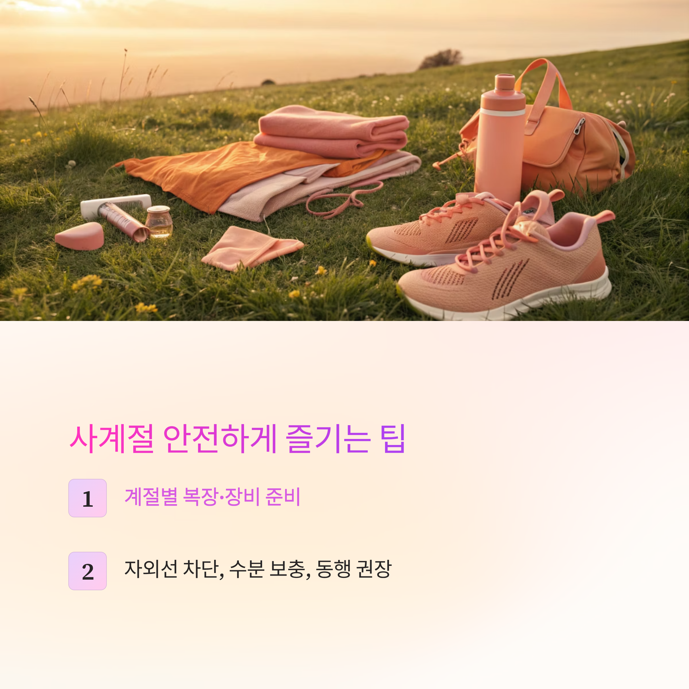 A3. 자외선 차단제, 모자, 물병, 응급용품 등 계절에 맞는 장비를 준비하는 것이 좋습니다.