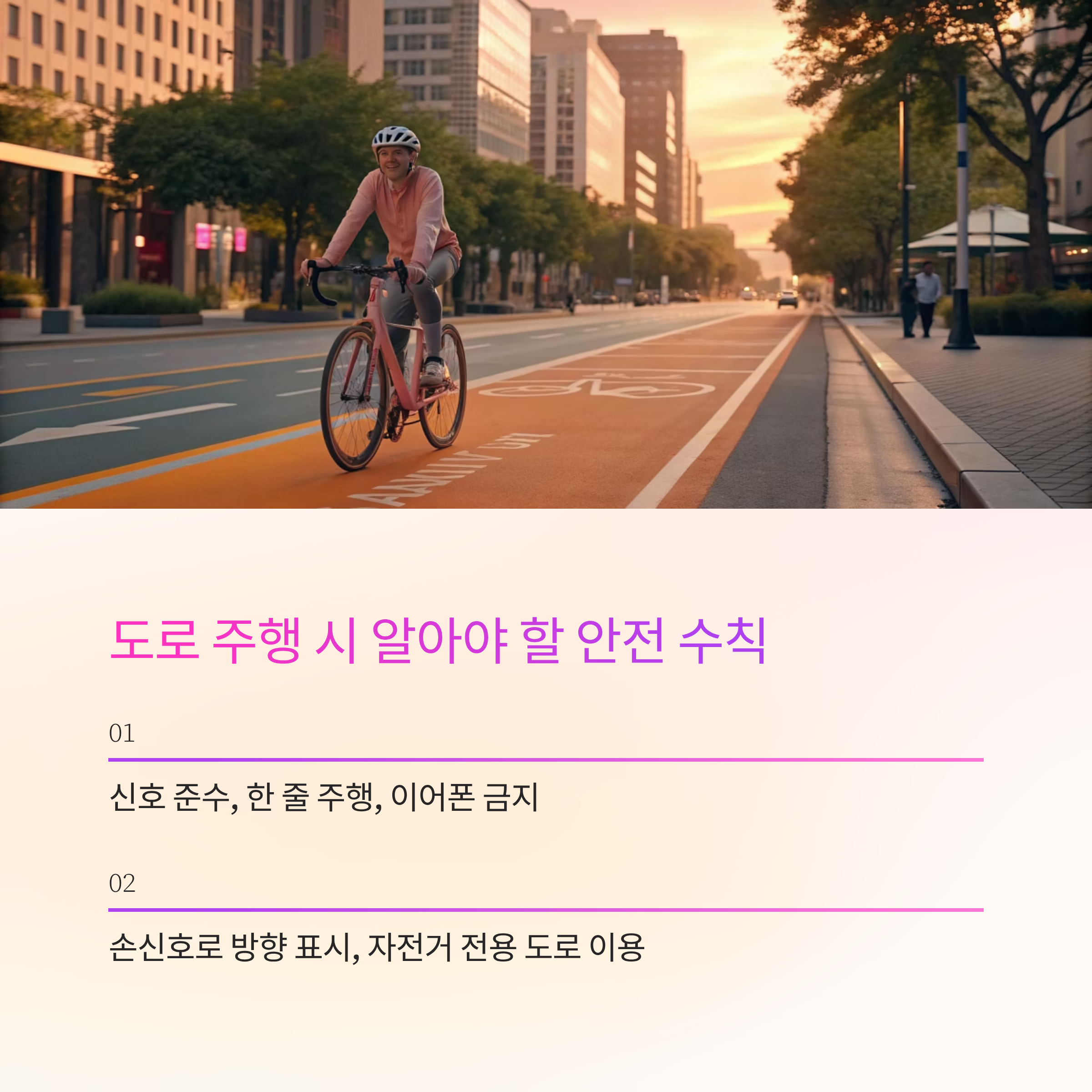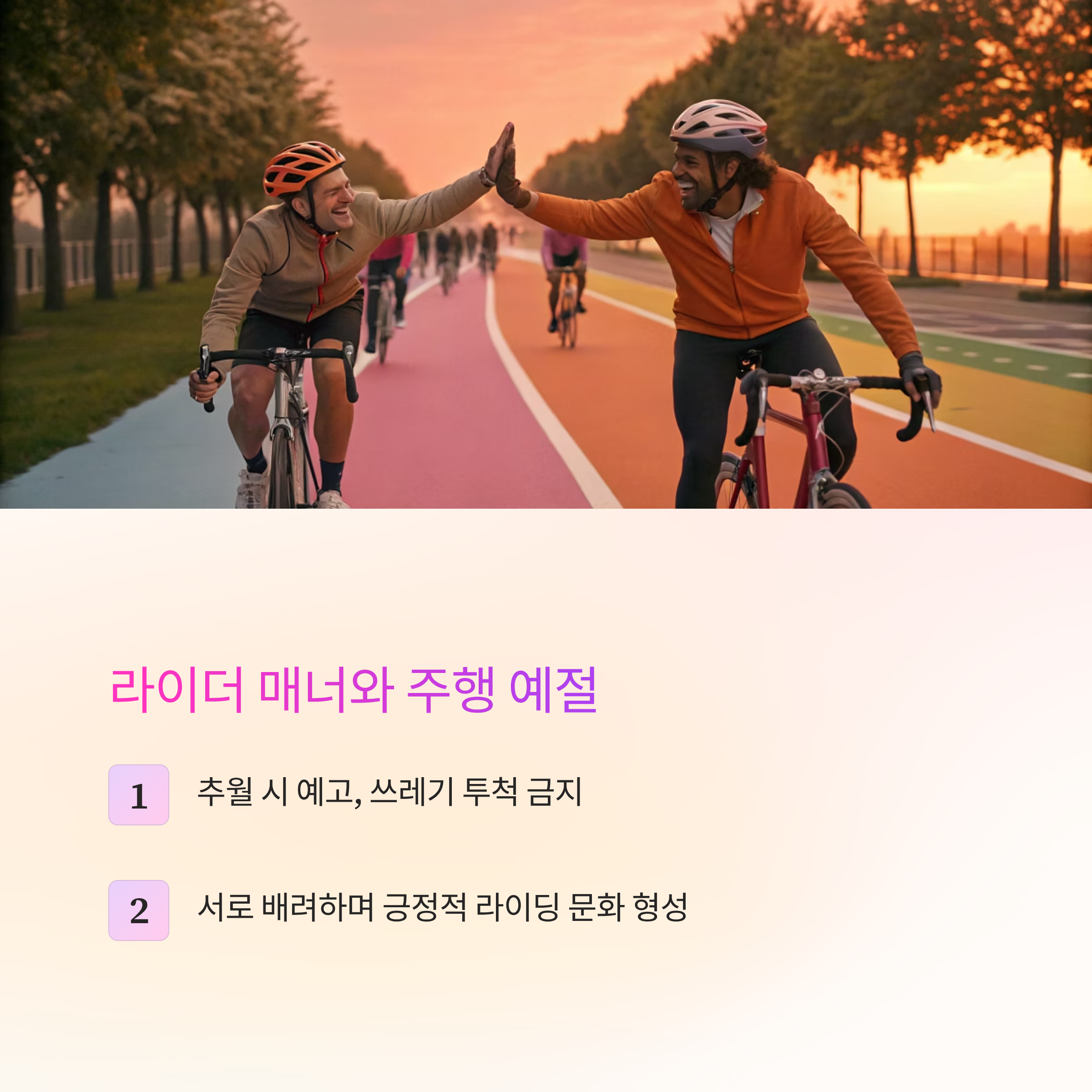 자전거는 혼자 타지만, 도로 위에서는 함께 움직이는 존재입니다. 좋은 매너는 모든 라이더의 안전을 지키는 기본입니다.