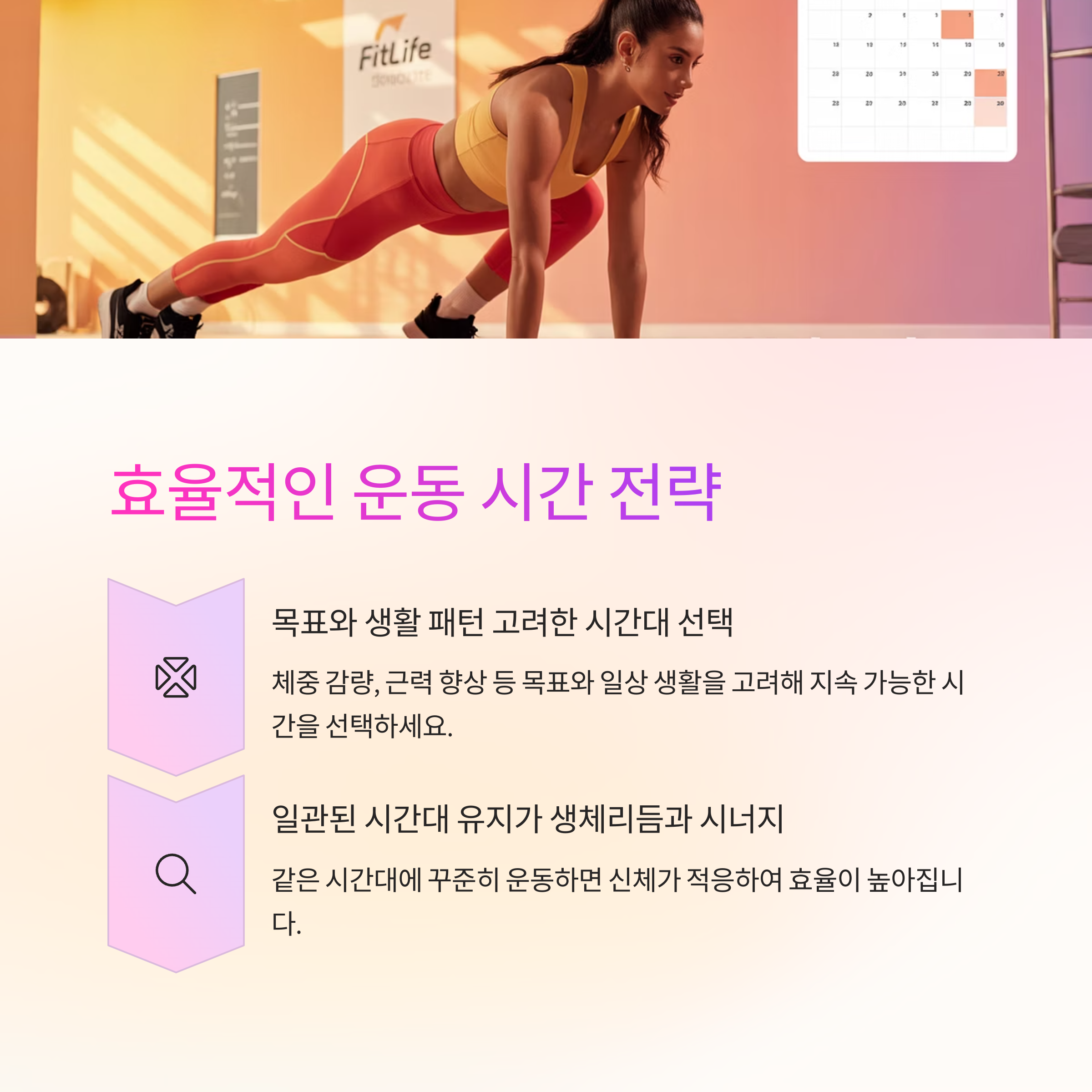 → 생체리듬과 목표에 따라 다릅니다. 일반적으로 퍼포먼스는 오후~저녁, 체지방 연소는 아침이 유리합니다.