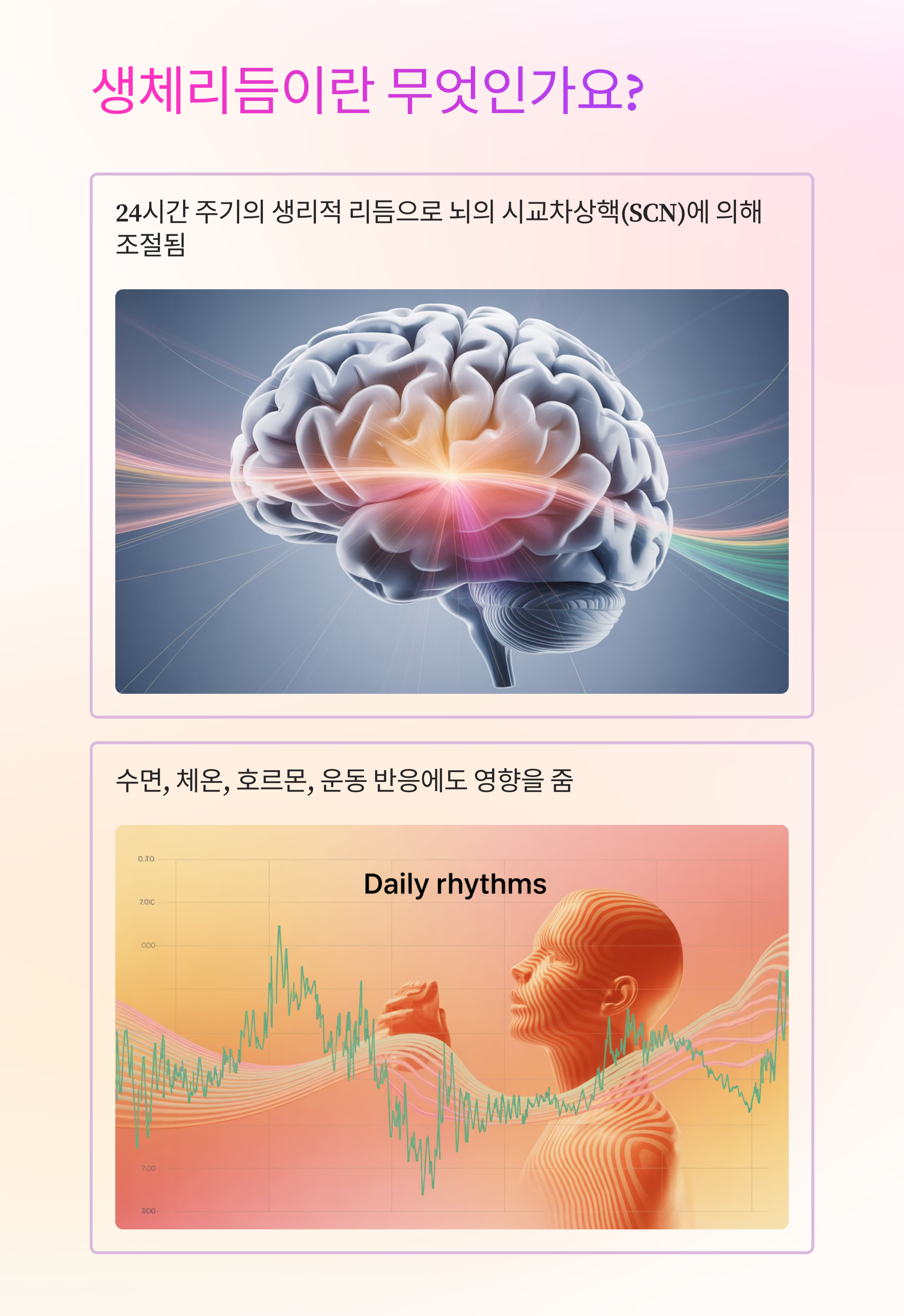 생체리듬은 인간을 포함한 생명체가 하루(24시간) 주기로 반복하는 생리적 리듬을 말합니다. 이 리듬은 뇌의 시상하부에 위치한 '시교차상핵(SCN)'에 의해 조절되며, 수면-각성 주기, 체온, 심박수, 호르몬 분비 등 다양한 생체 활동에 영향을 줍니다. 특히 운동 수행 능력과 회복력도 이 생체리듬과 깊은 연관이 있어, 같은 운동이라도 시간대에 따라 심박 반응, 근력, 지구력, 심지어 칼로리 소모량까지 달라질 수 있습니다. 따라서 자신의 생체리듬을 이해하고 그에 맞는 시간대를 선택하는 것이 운동 효율을 극대화하는 데 중요한 열쇠가 됩니다.