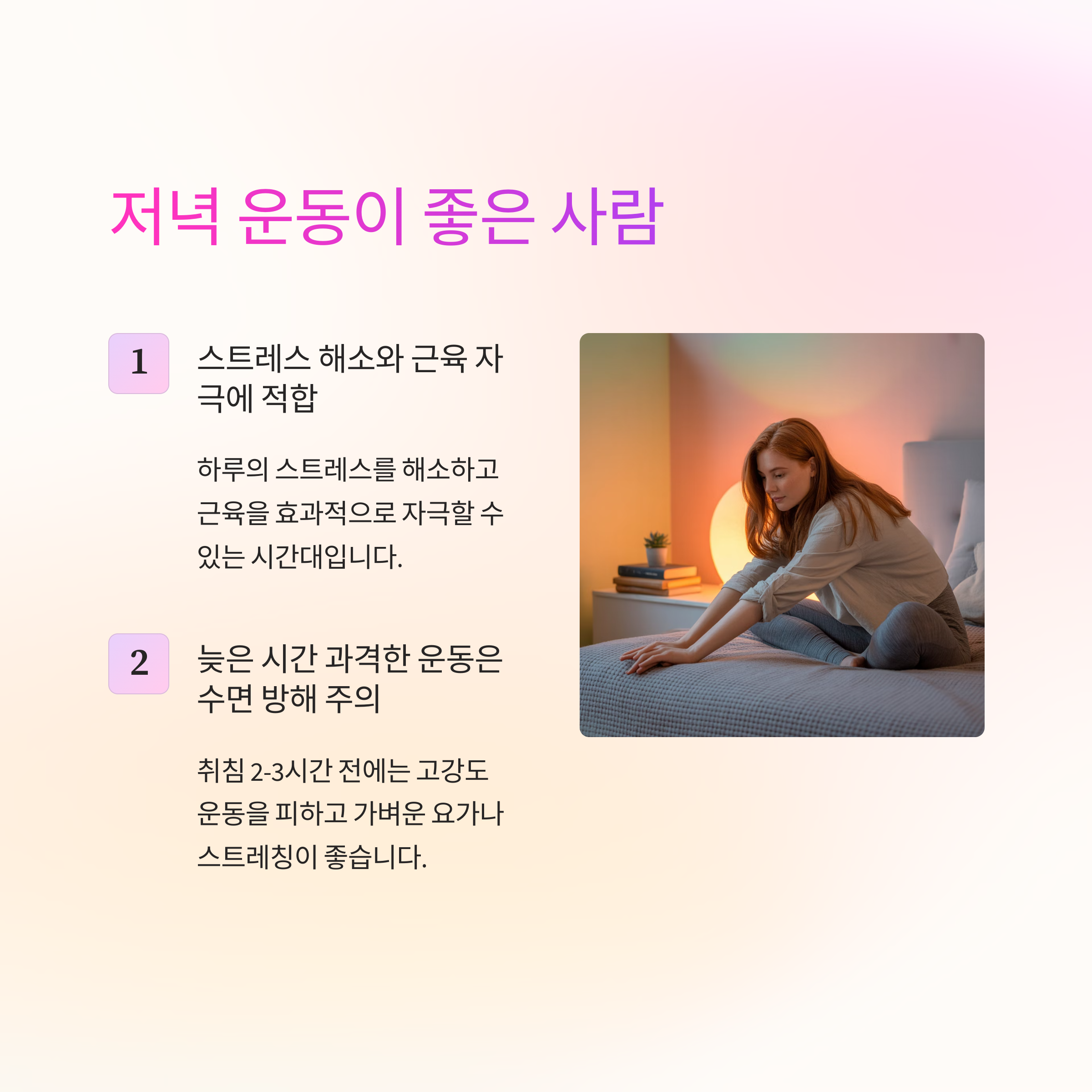 저녁 운동은 하루의 스트레스를 해소하고 숙면을 유도하는 데 좋은 선택입니다. 퇴근 후 시간을 활용해 근육 자극 위주의 웨이트나 고강도 트레이닝을 하면 체력 소모와 함께 긴장 완화 효과를 얻을 수 있습니다. 단, 취침 직전의 격한 운동은 오히려 각성 상태를 유발하여 수면의 질을 떨어뜨릴 수 있으므로, 운동은 잠들기 2~3시간 전에는 마무리하는 것이 좋습니다. 또한, 저녁 시간은 친구, 가족과 함께 운동하기에도 적합해 꾸준한 운동 습관 형성에 긍정적 영향을 미칩니다. 야간에도 충분히 밝은 실내 환경과 안전한 장소에서 운동을 진행하는 것이 중요합니다.
