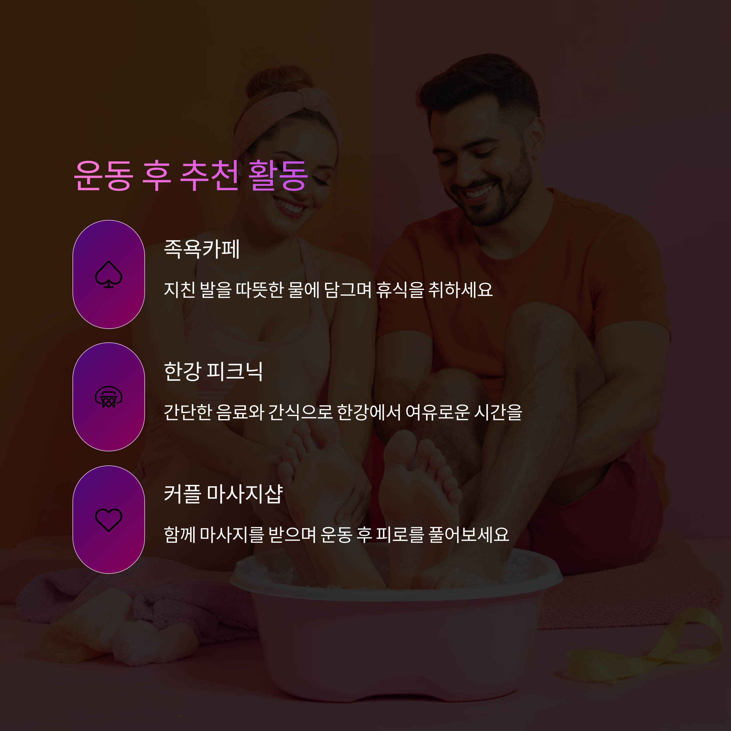 족욕 카페 홍대, 건대, 수유 등지 캐주얼하고 감성적 분위기 한강 피크닉 잠원, 망원, 뚝섬 한강공원 도시 속 힐링 코스 마사지샵 커플관리 강남, 신촌, 합정 등 프라이빗하고 조용한 공간