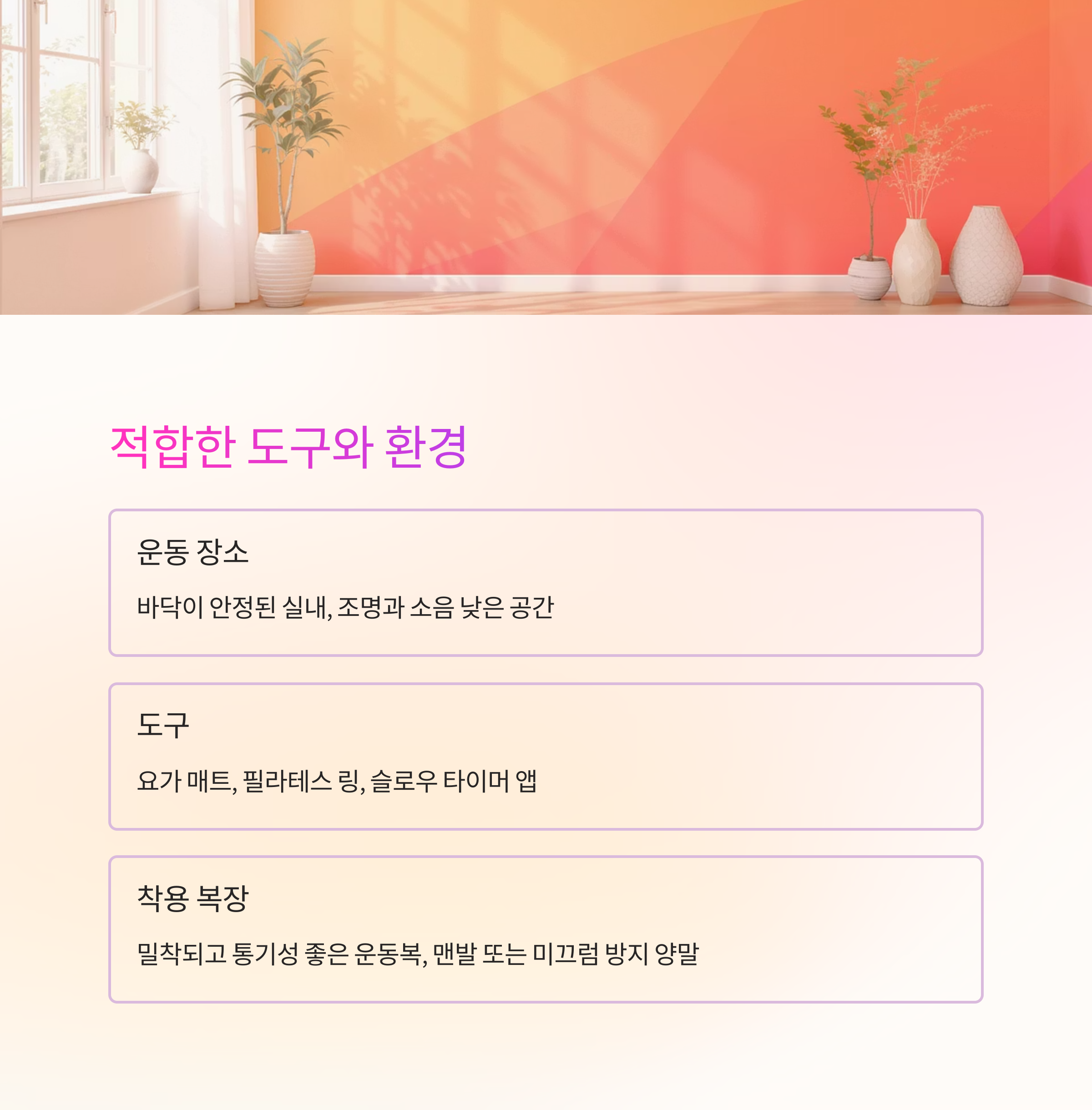 | 도구 | 요가 매트, 필라테스 링, 슬로우 타이머 앱 등 |