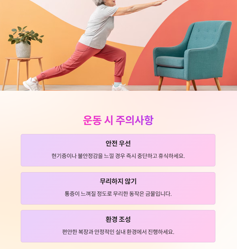 - 운동은 항상 편안한 복장과 안정적인 실내 환경에서 진행합니다.
