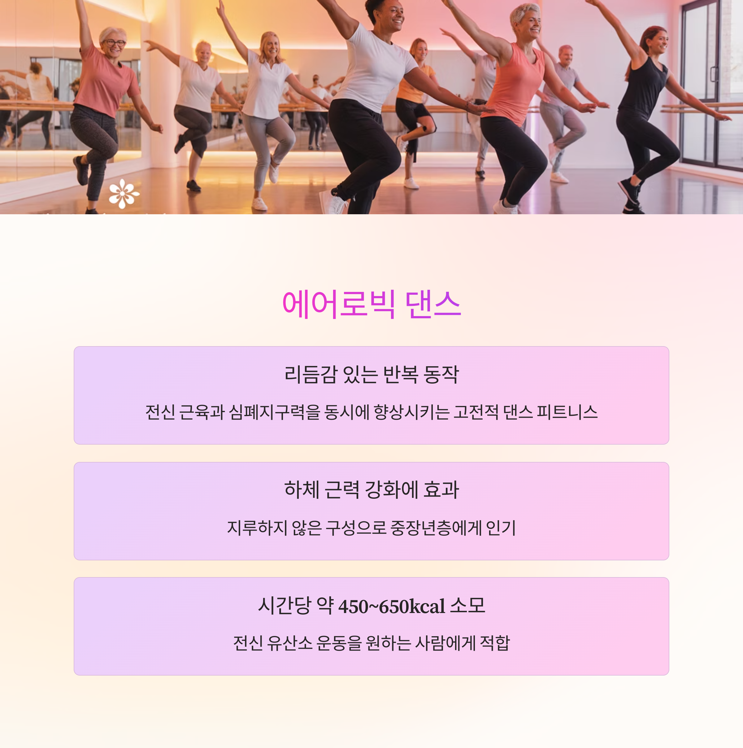 전신 유산소 운동이면서도 안무가 단순해 초보자도 쉽게 접근할 수 있습니다.