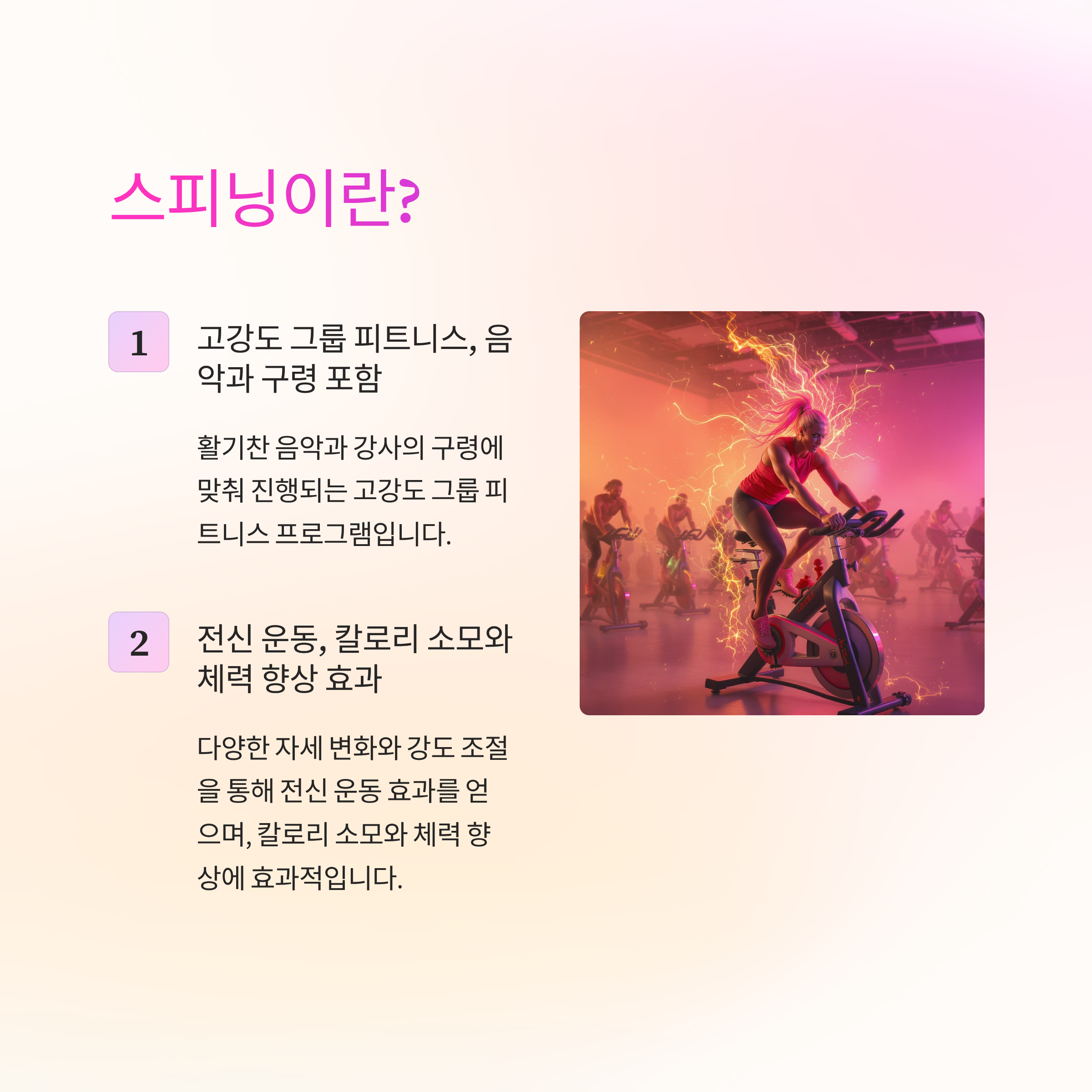 스피닝은 고정식 실내 자전거를 이용한 그룹 피트니스 프로그램으로, 강한 음악과 트레이너의 구령에 맞춰 강도 높은 인터벌 트레이닝을 진행합니다. 좌석에 앉은 상태뿐만 아니라 일어나서 페달을 밟는 동작(스탠딩 라이딩)과 팔·상체를 활용하는 동작이 포함되어 전신 운동 효과가 큽니다. 심박수를 단기간에 높였다 낮추는 방식으로 진행돼 지방 연소와 심폐 기능 향상에 탁월합니다. 다만 강도가 높아 초보자는 처음부터 무리하지 않는 것이 중요합니다.