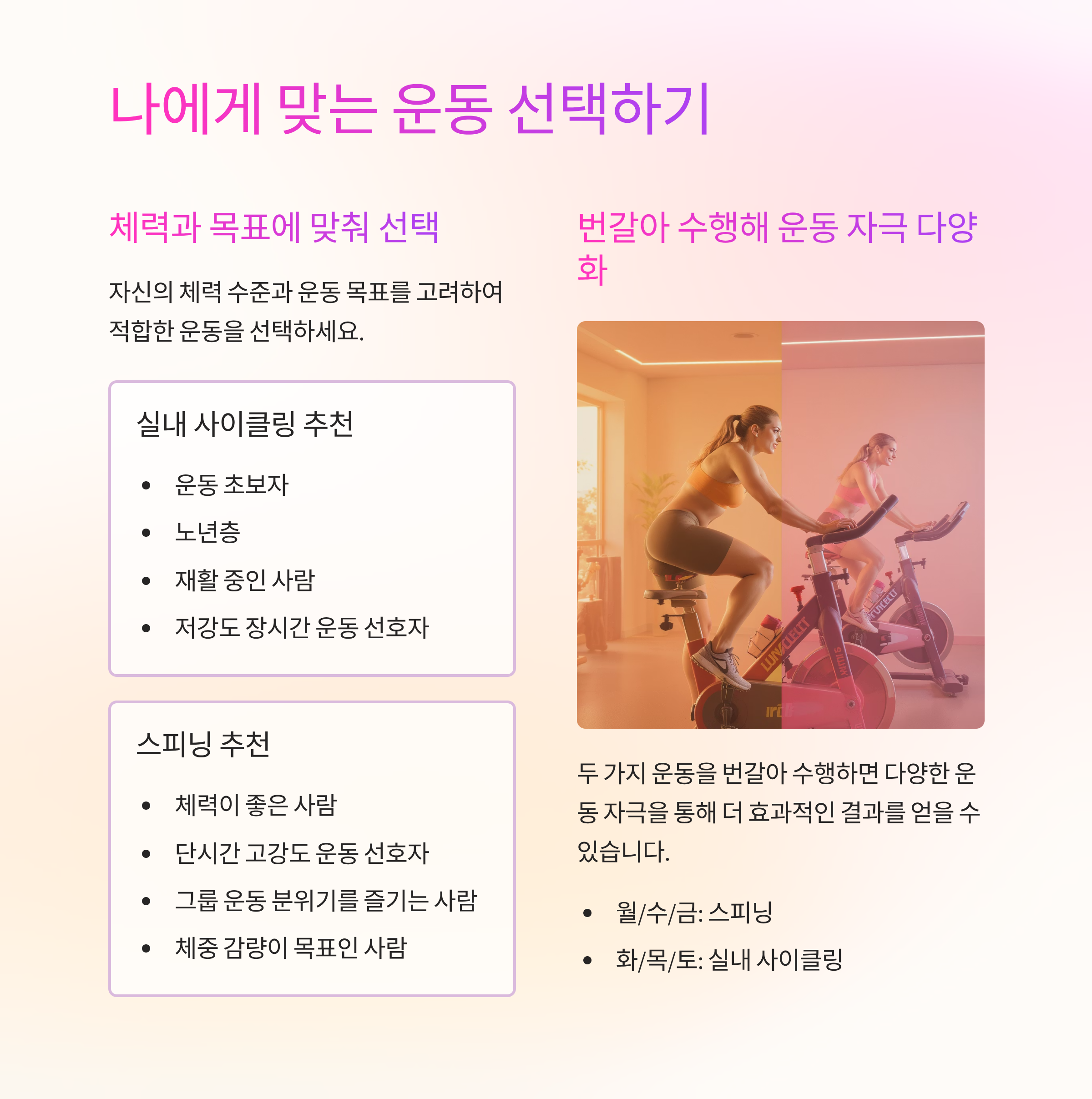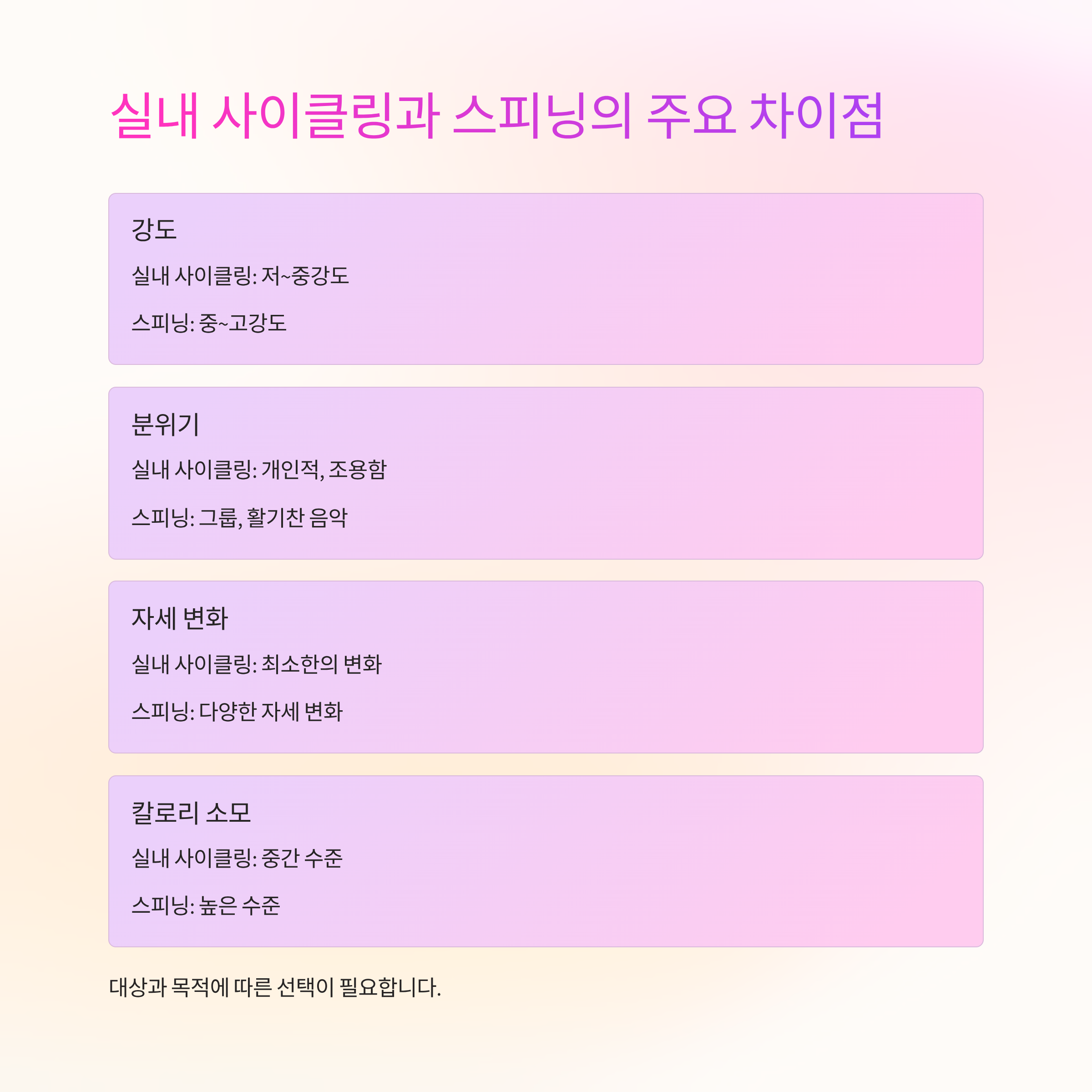 3. 운동 방식 — 실내 사이클링은 앉아서 일정 페이스 유지, 스피닝은 다양한 자세 변화를 포함합니다.