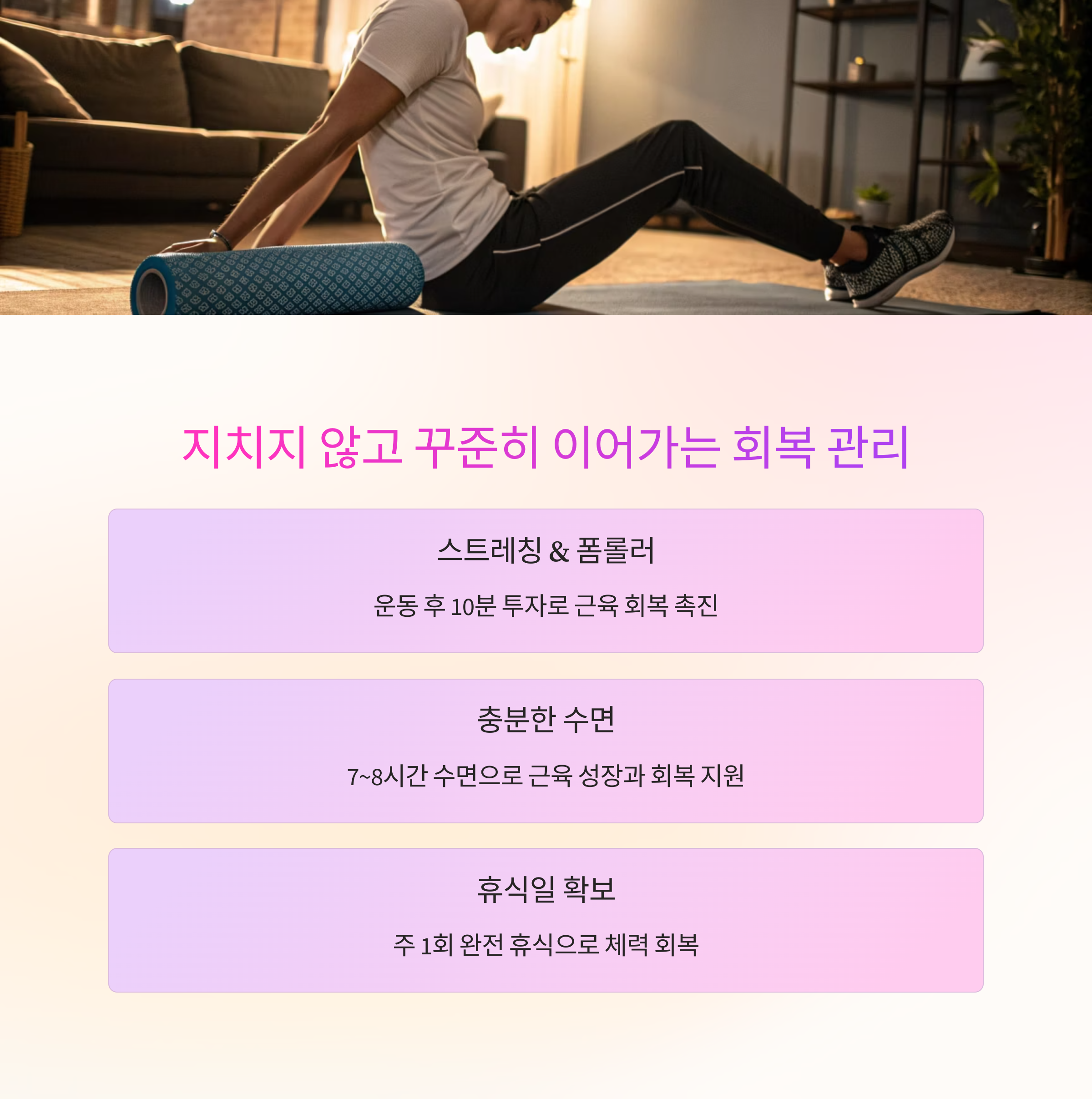 회복도 운동의 일부라는 마음가짐으로 접근하면 꾸준함을 유지할 수 있습니다.