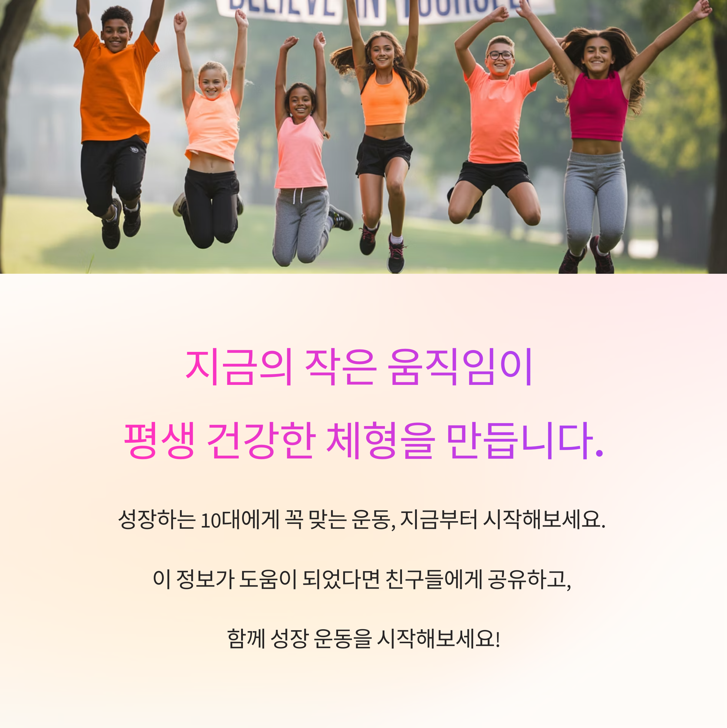 지금의 작은 움직임이 평생 건강한 체형을 만듭니다. 성장하는 10대에게 꼭 맞는 운동, 지금부터 시작해 보세요.