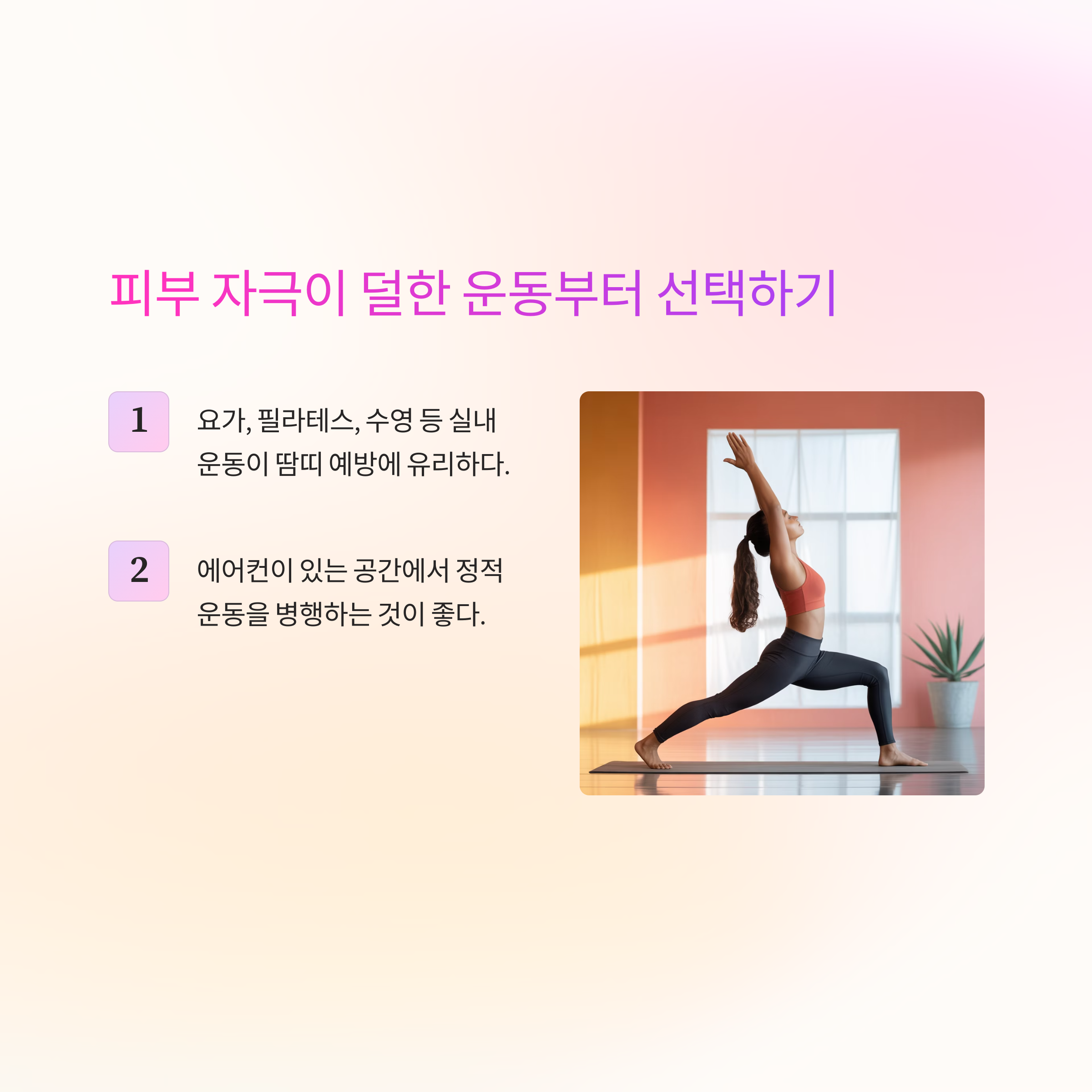 피부 민감할 땐 수영, 요가, 필라테스처럼 에어컨이 있는 실내 정적 운동을 고려해 보세요.