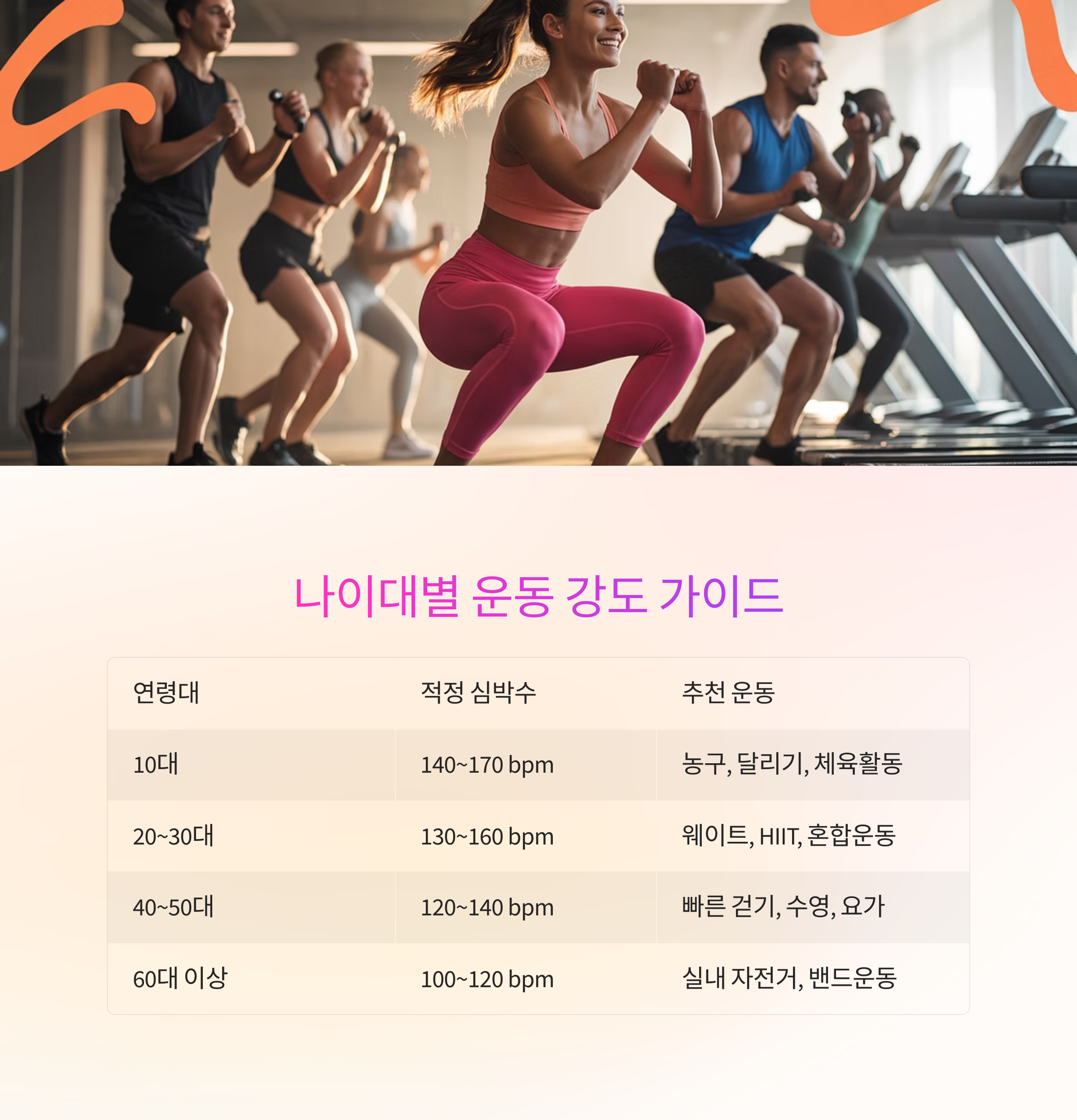| 20~30대 | 체력 향상, 체형관리 | 130~160 bpm | 웨이트, 러닝, HIIT, 유산소+무산소 혼합 |