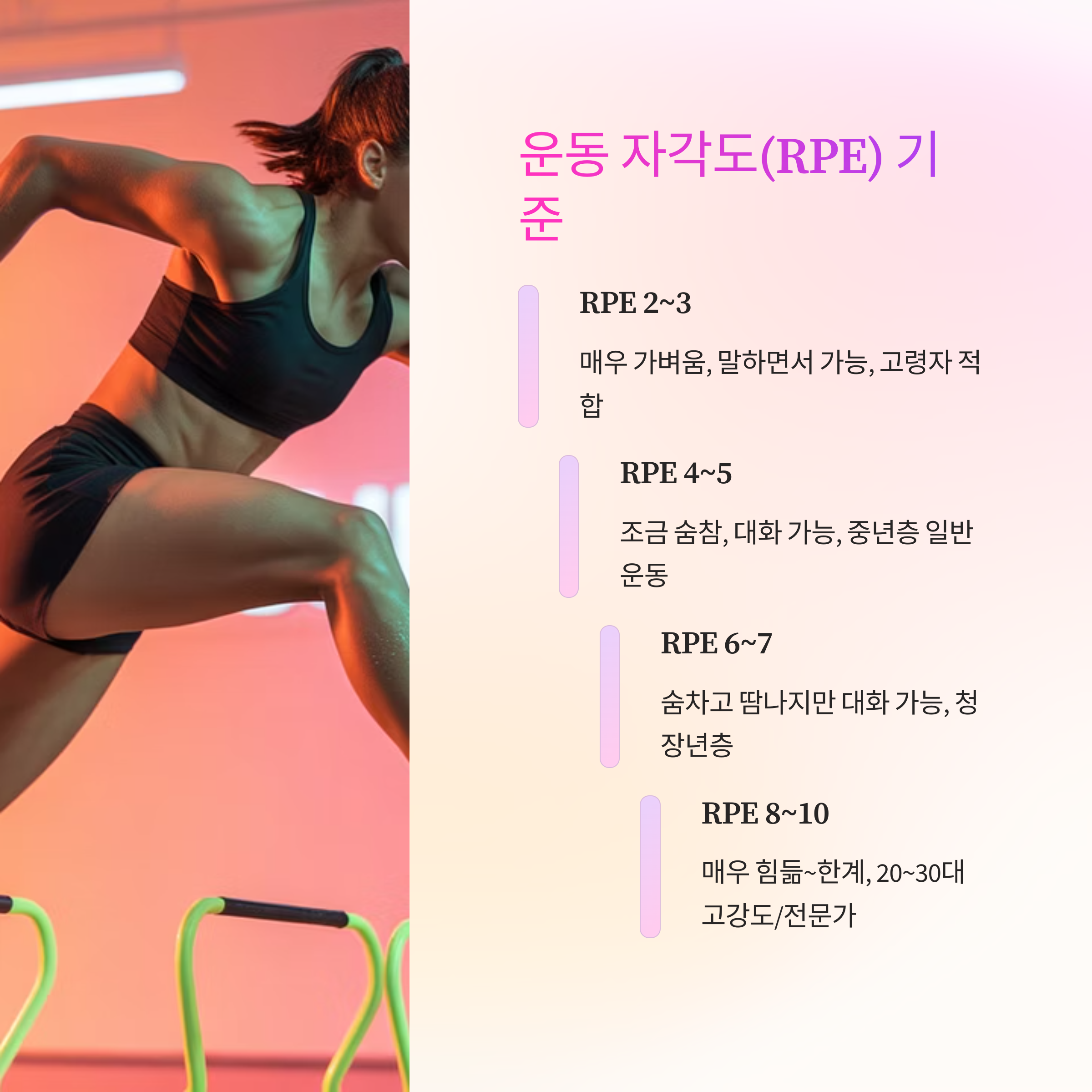 - RPE(운동 자각도): 1~10단계로 주관적인 운동 난이도 표현