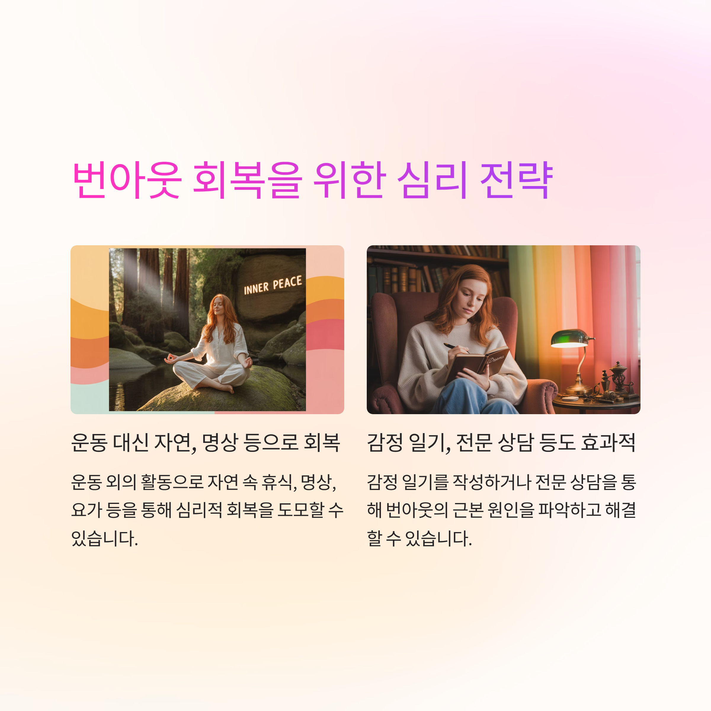 운동은 건강을 지키는 최고의 습관이지만, 과유불급이라는 말처럼 지나치게 몰입하거나 강박적으로 지속하면 오히려 번아웃에 빠질 수 있습니다. 운동 번아웃은 단순한 피로감이 아닌, 심리적 소진과 동기 저하까지 이어지며 삶의 질을 떨어뜨리는 중요한 문제입니다. 이번 글에서는 심리학적 관점에서 운동 번아웃을 진단하고, 회복을 위한 실질적인 방법과 예방 루틴까지 함께 정리해 드립니다.
