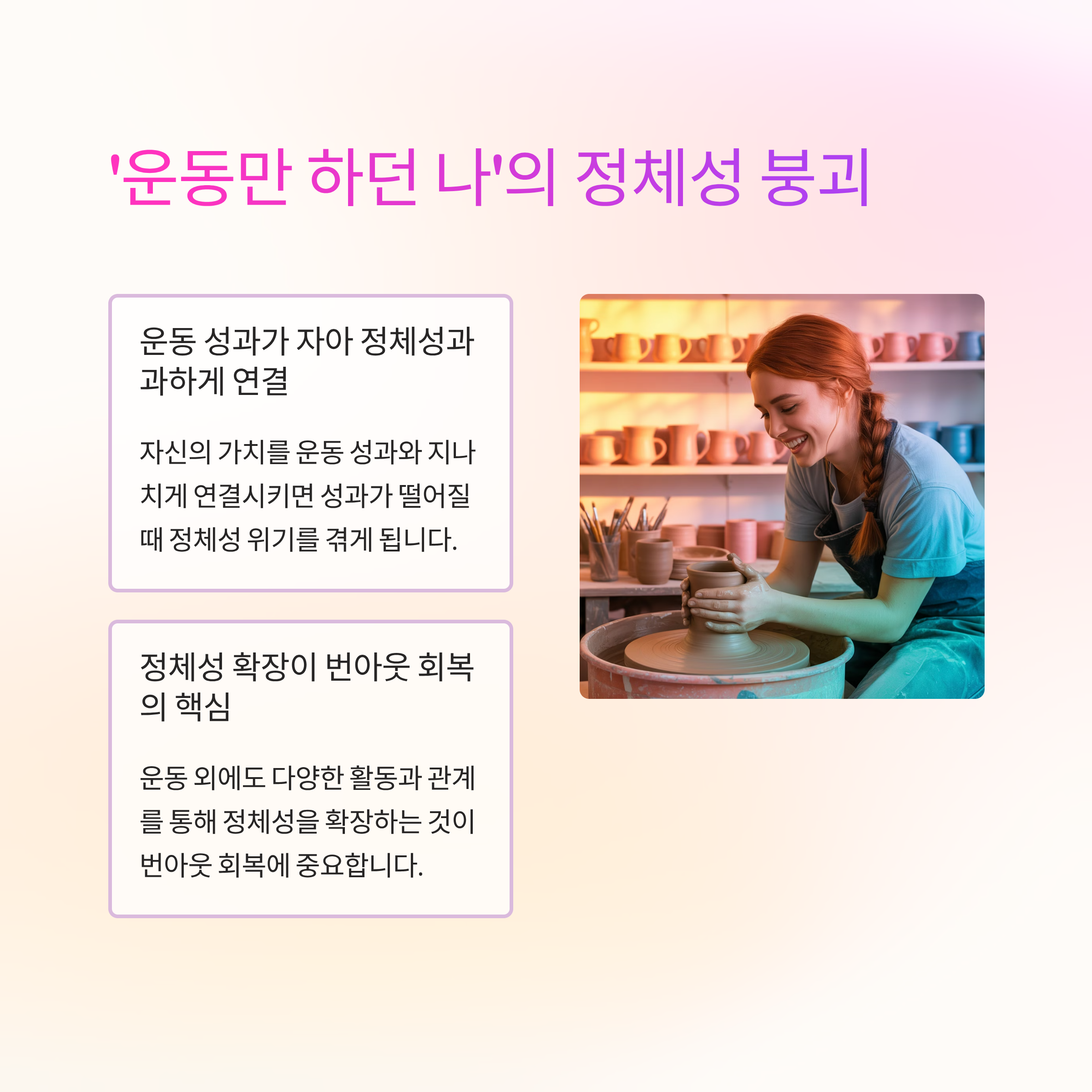 오랫동안 운동을 일상의 중심으로 삼았던 사람들은, 번아웃이 오면 ‘나는 누구지?’라는 공허감에 빠질 수 있습니다. 운동 성과가 자기 정체성과 동일시될수록, 성과가 정체되거나 동기 부여가 끊기면 삶의 의욕 전체가 저하될 수 있습니다. 이는 흔히 운동 중심 정체성 붕괴로 표현되며, 회복을 위해선 정체성의 확장 — 즉 운동 외의 즐거움, 관계, 취미를 다시 찾는 작업이 필요합니다.