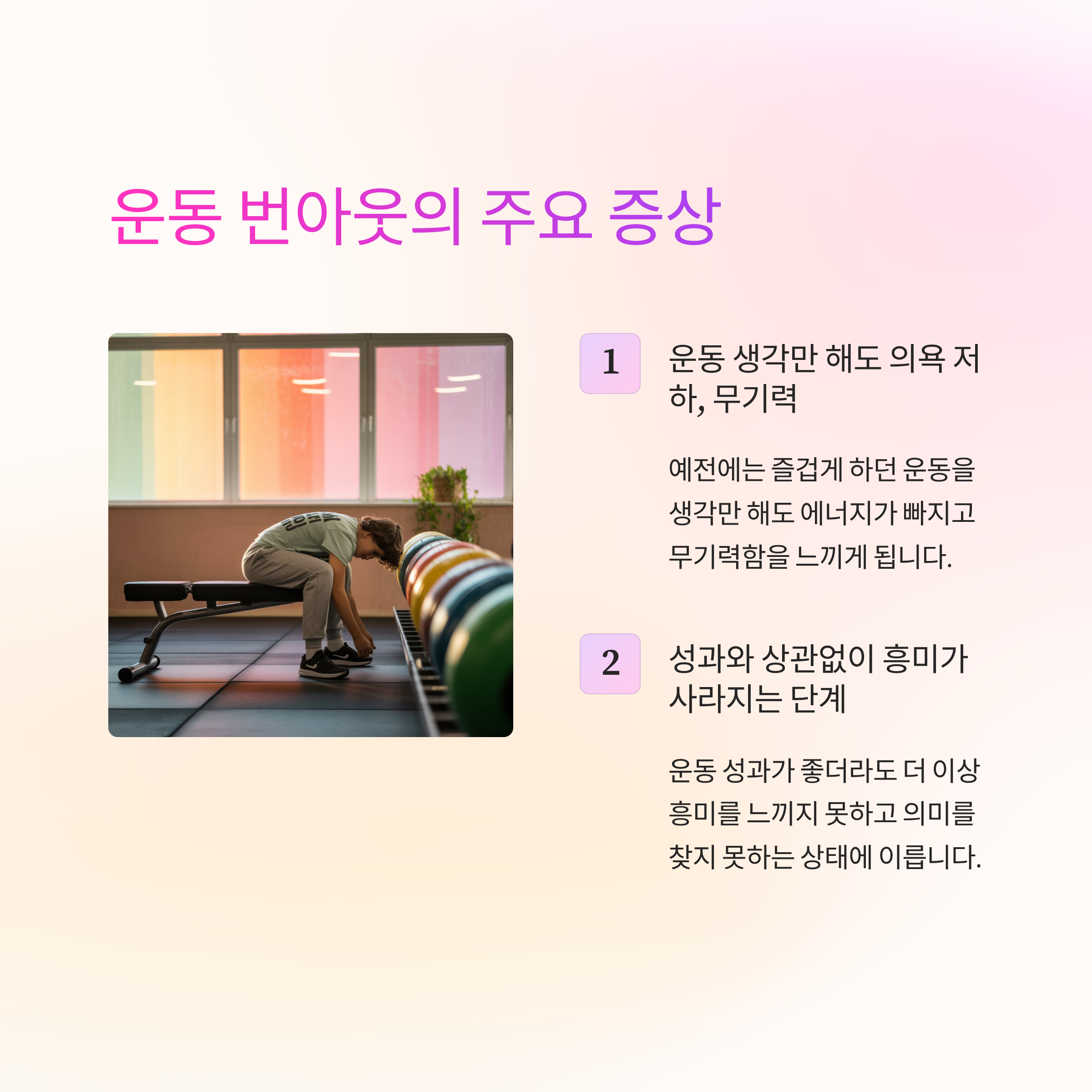 운동 번아웃은 몸뿐 아니라 마음의 변화로 먼저 나타납니다. 아래와 같은 신호가 나타난다면 번아웃의 시작일 수 있습니다.