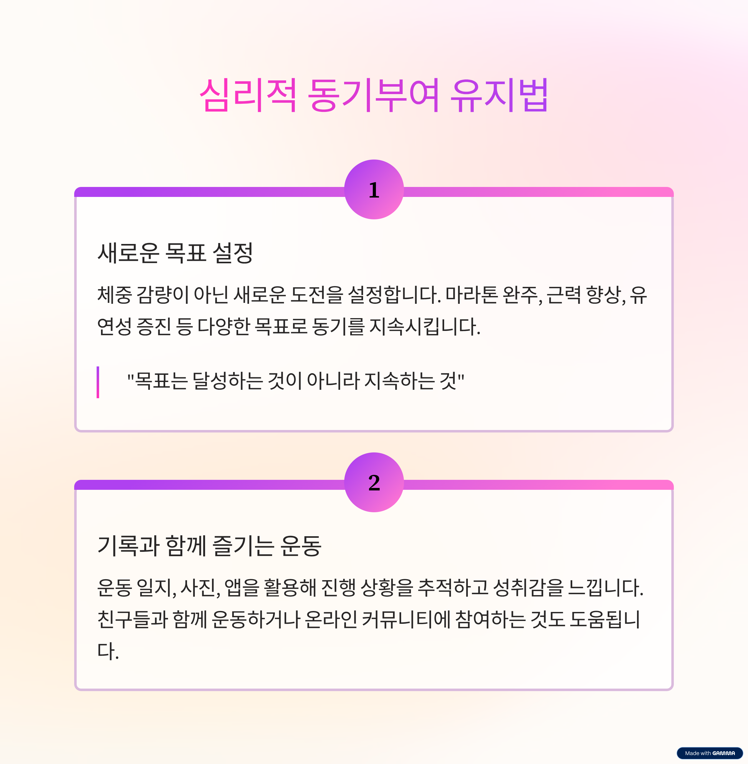 운동 목표를 달성하면 성취감과 함께 긴장감이 풀려 동기부여가 떨어지기 쉽습니다. 이럴 때는 새로운 목표를 설정하거나, 기록을 남기며 성취감을 이어가는 것이 중요합니다. 예를 들어 러닝 대회 참가, 체형 변화 기록, 새로운 운동 종목 도전 등이 동기부여에 도움이 됩니다. 또한 가족이나 친구와 함께하는 운동은 즐거움과 지속성을 높여줍니다.