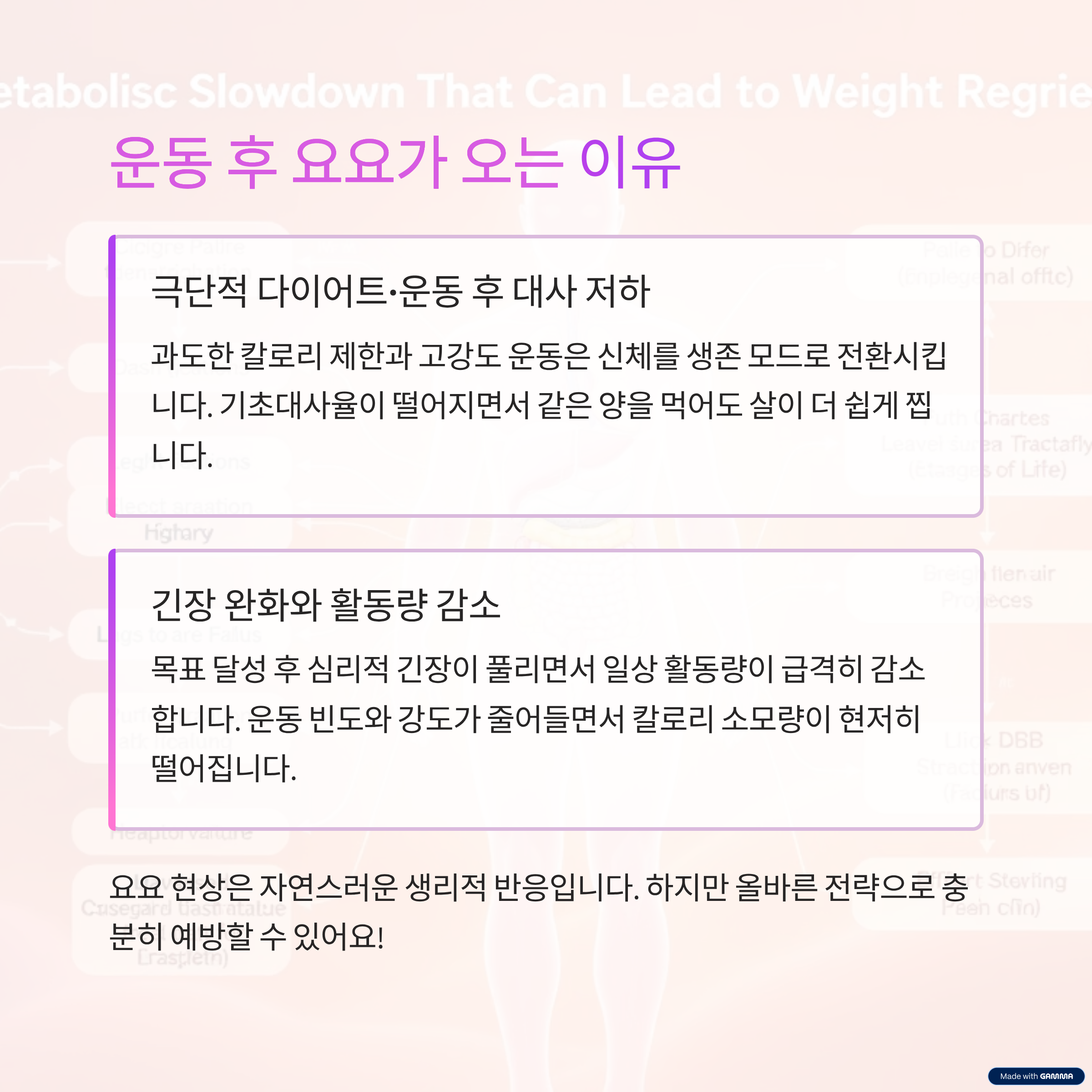 요요 현상은 대부분 과도한 운동이나 극단적인 식단 후에 발생합니다. 체중 감량 과정에서 기초대사가 떨어지고, 갑작스럽게 원래의 식습관으로 돌아가면 지방이 빠르게 쌓이게 됩니다. 또한 운동 목표 달성 후 긴장이 풀리면서 활동량이 줄어드는 것도 원인 중 하나입니다. 즉, 요요는 단순히 “의지 부족”이 아니라, 생리적·심리적 요인이 결합해 나타나는 현상입니다.