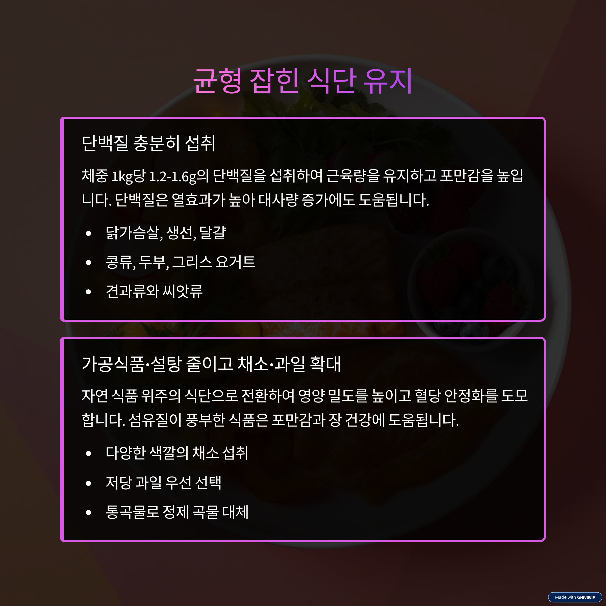 A1. 다이어트보다는 체중 유지와 근육 보존을 위한 균형 잡힌 식단과 운동이 필요합니다.