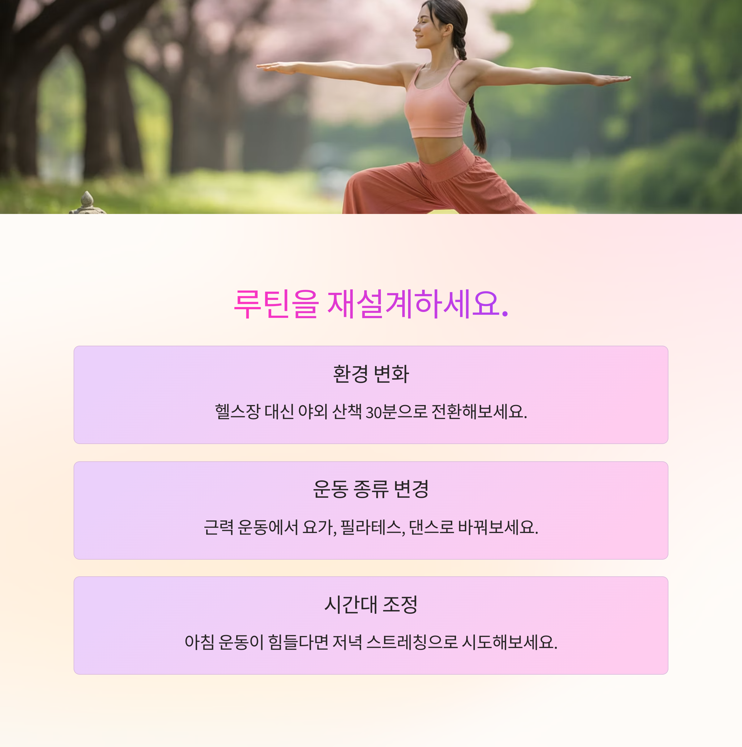 • 근력 루틴 → 요가, 필라테스, 댄스 등 감각 중심 운동으로 변경