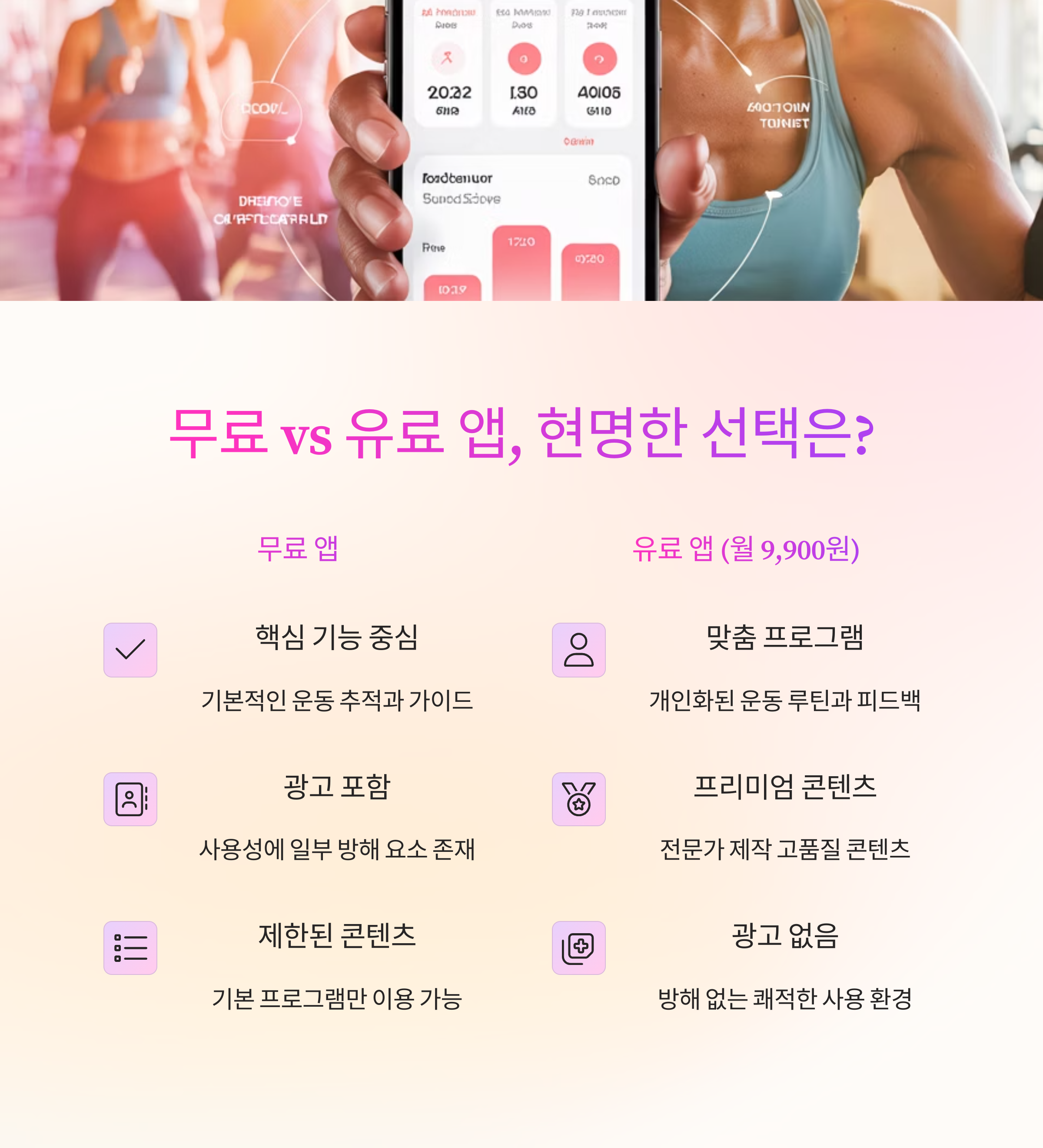 • 유료 앱 장점: 맞춤형 관리, 광고 없음, 프리미엄 콘텐츠