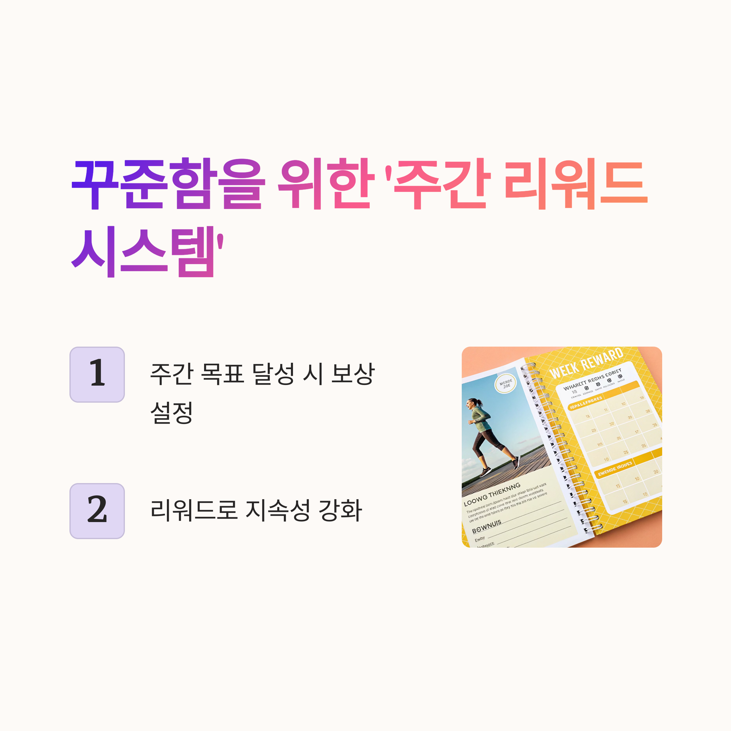 일주일 목표를 채웠다면 작은 보상을 설정해 보세요. 예: “5일 운동 성공 시 좋아하는 다이어리 스티커 세트 선물!” 스스로에게 주는 리워드는 즐거움과 지속력 모두를 챙길 수 있습니다.