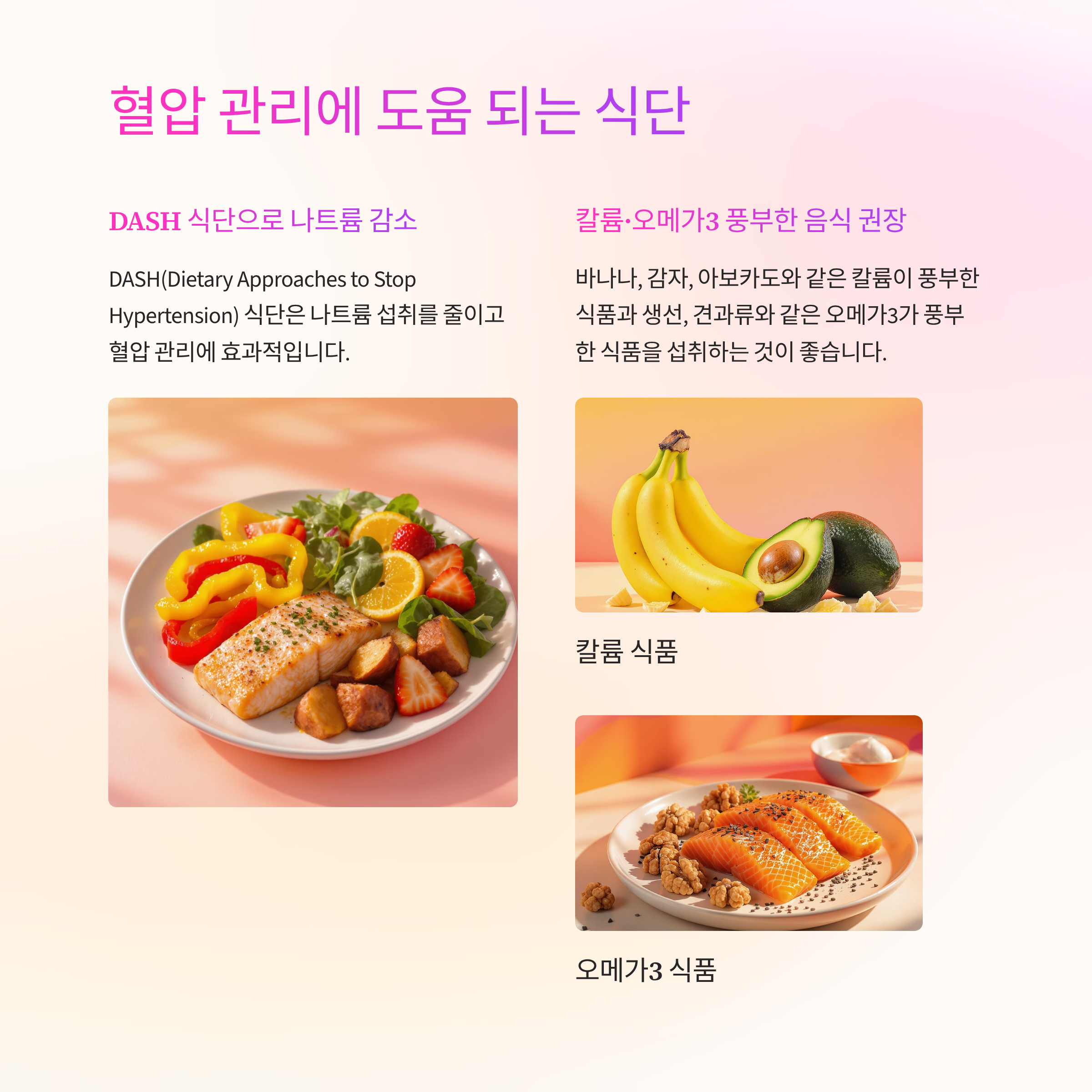 대표적으로 DASH 식단이 혈압 조절에 효과적입니다. 채소, 과일, 통곡물, 저지방 단백질을 중심으로 하며, 나트륨 섭취를 하루 2,300mg 이하로 줄이는 것이 핵심입니다. 칼륨이 풍부한 바나나, 고구마, 시금치 등은 나트륨 배출을 도와 혈압 안정화에 기여합니다. 또한 오메가3 지방산이 풍부한 연어나 견과류도 심혈관 건강에 좋습니다.